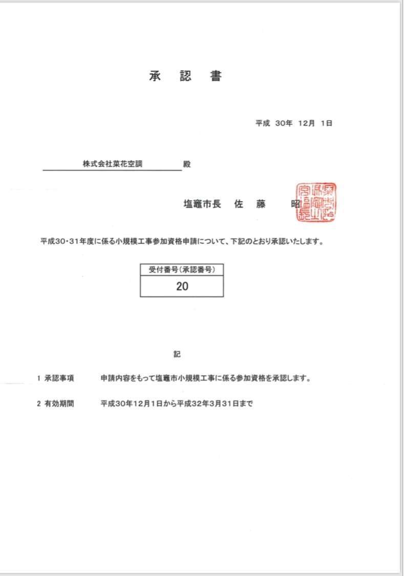 この度 菜花空調は塩竈市の入札参加資格を取得致しました。