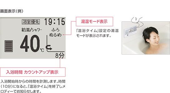 気温によって、今日は寒い、ちょっと熱いなど入浴中に感じる点も、10分間の「温浴タイム保温」で感覚的にオートで調節してくれます。