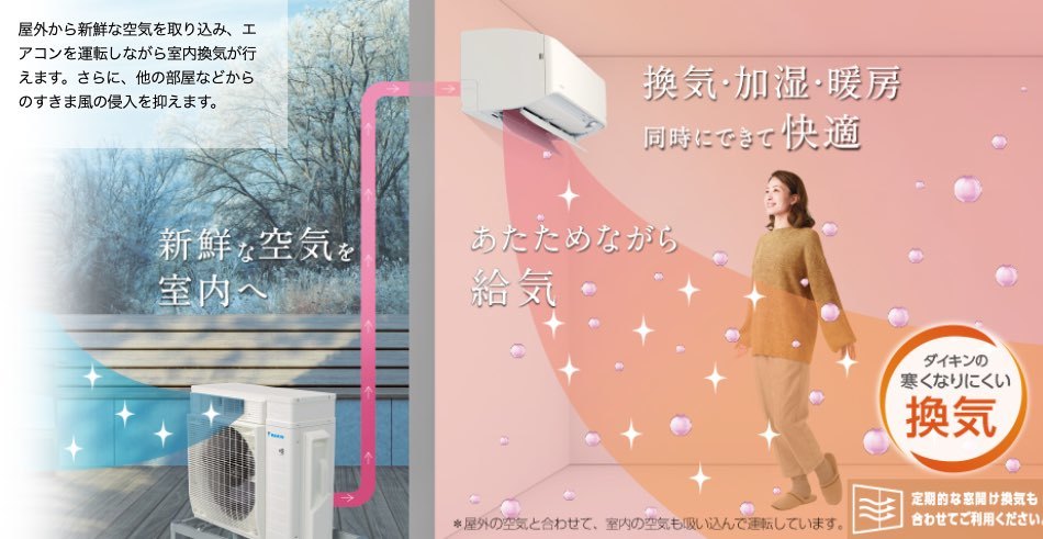 このうるさらXなら、屋外から新鮮な空気を取り込んで、エアコンを運転しながらでも室内換気を同時に行えるので大変便利です。