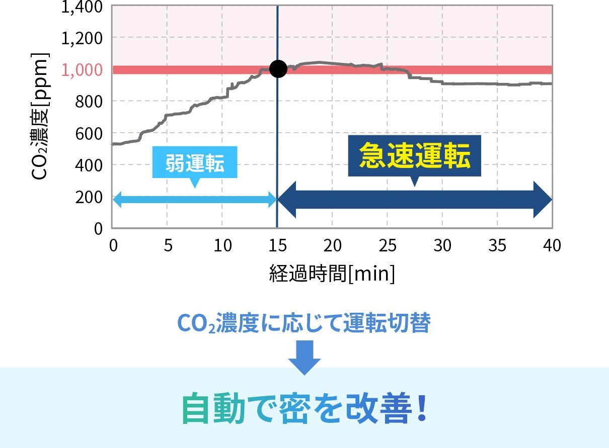 室内のCO2濃度を検知し、人が少ないときは弱運転、人が多いときは急速運転に自動で切り替えてくれます。