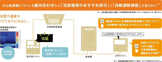 ・対応熱源機とリモコンのコンビで使える「浴室暖房のおすすめ表示」や「自動連続機能」