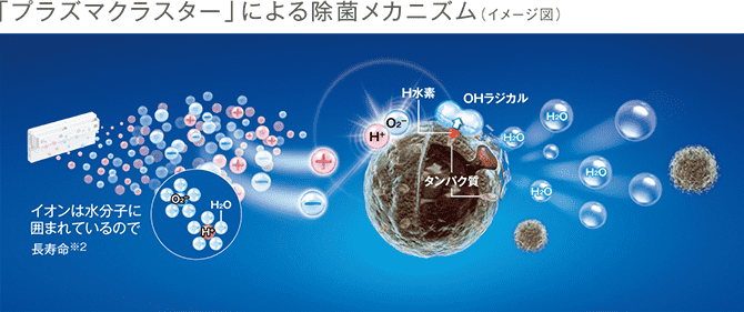 実は、「バスほっと」にはプラズマクラスター技術という味方がついています。これは、乾燥運転時にプラズマ放電によって作り出された自然界と同じイオンが、浴室内に浮遊する「浮遊カビ菌」のタンパク質を分解・除去した後、水に戻るという技術です。