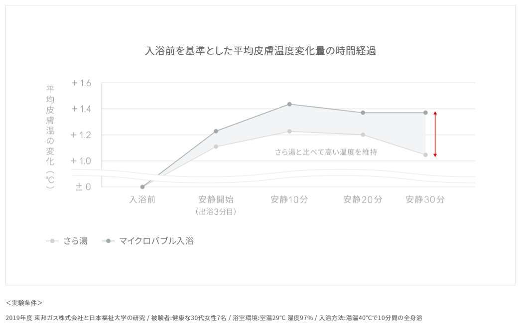 体を芯から温める効果です。気泡で体を包み込み、お湯から体への熱伝導を緩やかにすることで、ゆっくりと体を温めます。普通のお湯よりも体が温まるのに加え、入浴後もゆっくりと熱が放出されるため、体がポカポカした状態が続き、湯冷めしにくくなります。