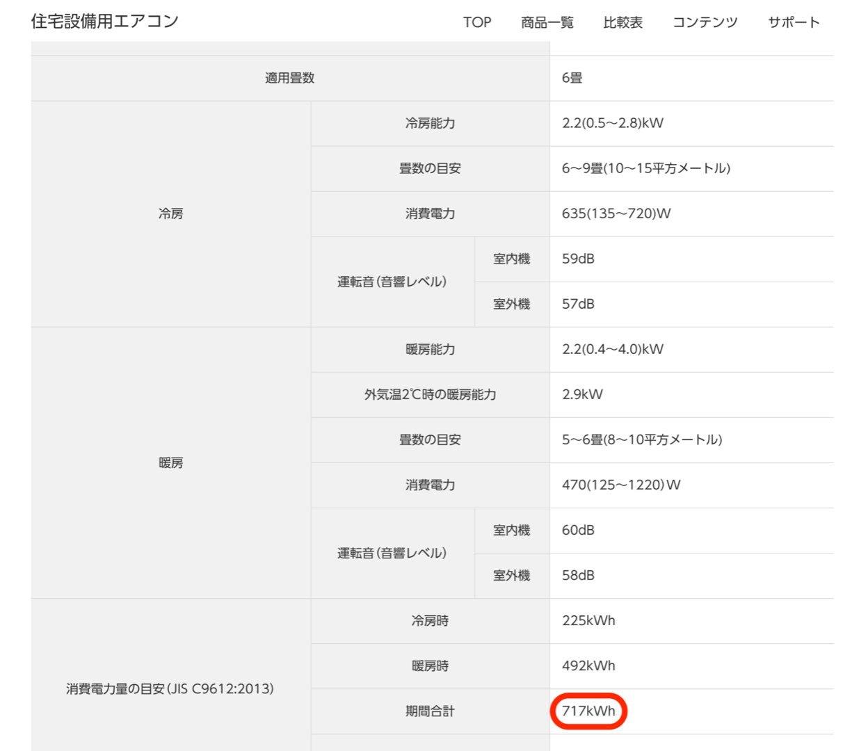 「期間消費電力」は上記のような、エアコンのカタログに載っています。