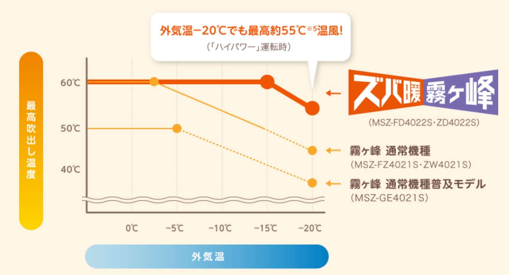 外気温-20℃でも最高約55℃の温風が出ます。また、高速起動と大容量コンプレッサーにより、暖房の立ち上がり時間を短縮させます。それにより、たった15分で室温5℃から20℃へ暖めることができます。