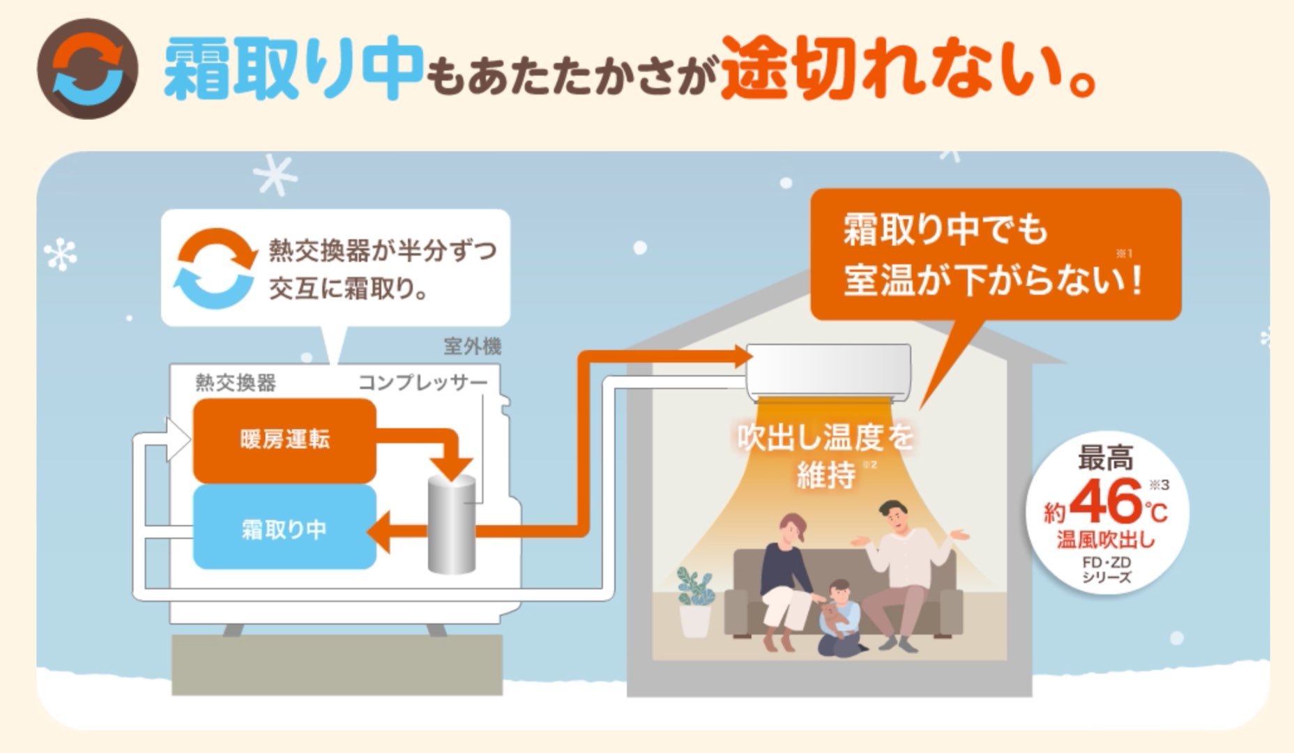 室外機の熱交換器が分かれているため、霜取り中でも運転が止まりません。コンプレッサー(熱を移動させる流体を圧縮し、空気の温度を変化させる機械)が大容量でパワフルなので、熱交換器が半分になっても吹き出し温度を維持します。