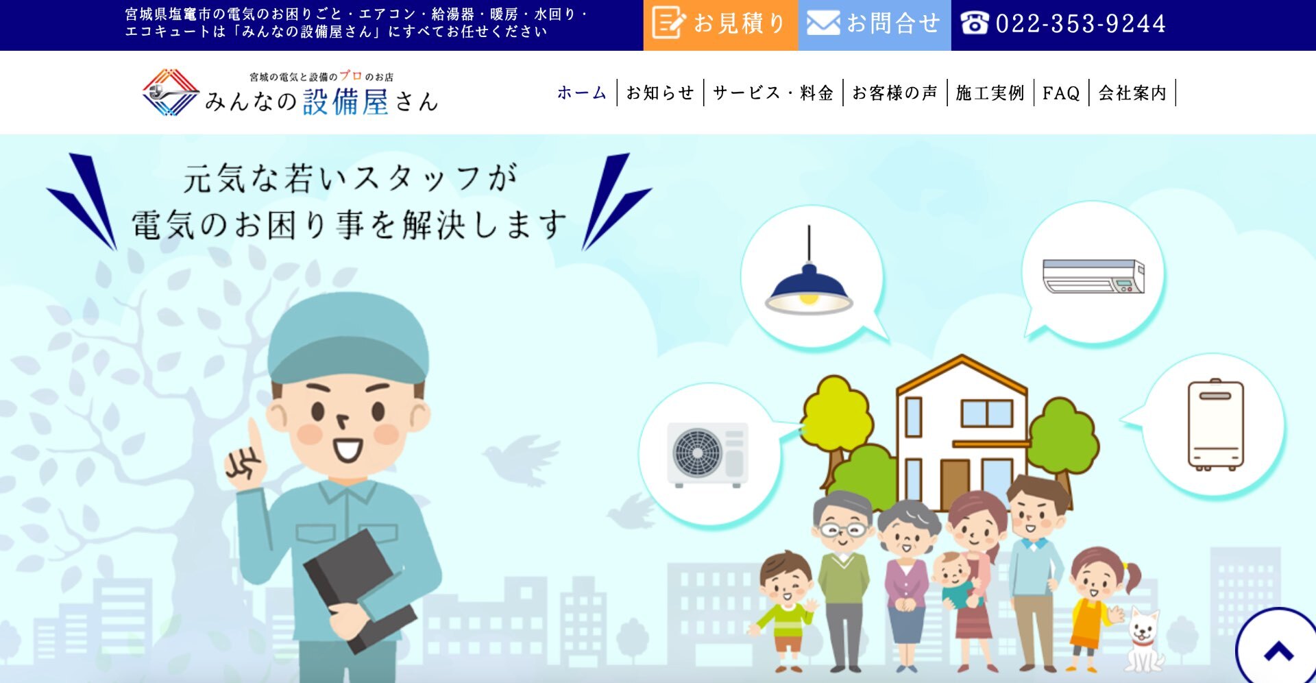 宮城県塩竈市の電気のお困りごと・エアコン・給湯器・暖房・水回り・エコキュートは「みんなの設備屋さん」に全てお任せください。