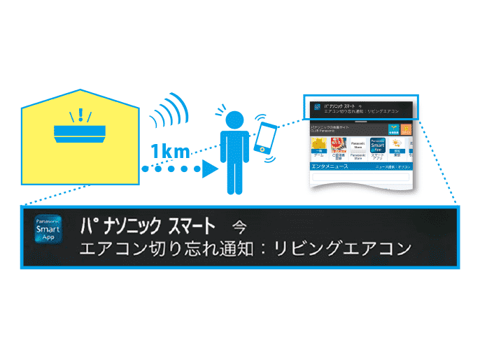 エアコンを運転したまま自宅から1km離れたら、自動で切り忘れ通知が届きます。