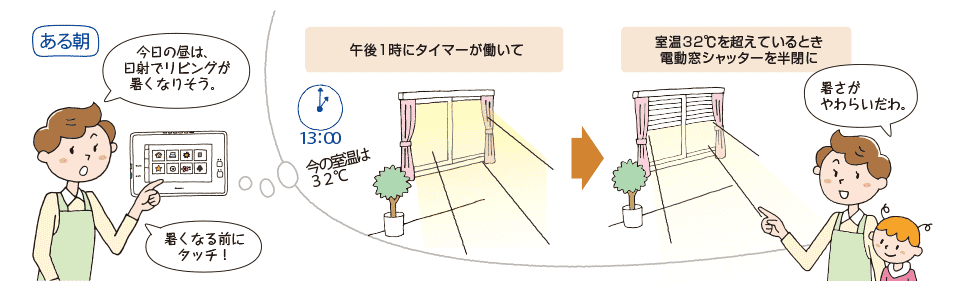 シャッターと連動させれば、朝は指定の時間に開ける予約ができたり、日射量に応じて窓のシャッターを閉めて室温上昇を和らげる設定ができたりします。