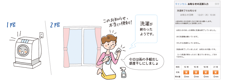 洗濯機や食洗機と連動させて、運転終了をプッシュで通知するように設定すれば、洗い物の取り出し忘れも防止できます。