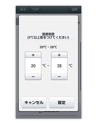お手持ちのスマートフォンで、遠隔操作や室温の確認ができます。