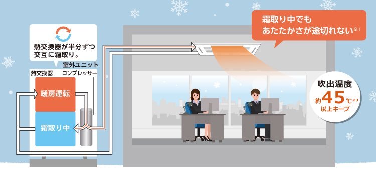 通常エアコン暖房は室外機に霜が付くと、暖房運転を停止して霜を溶かす「霜取り」をする必要があります。寒さの厳しい中では短時間の霜取りでも室温が低下することがあるのです。