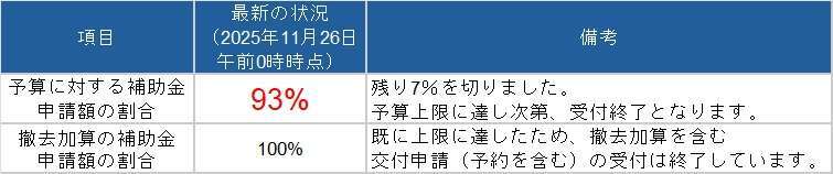 事務局は、予算上限(100%)に達し次第、交付申請の受付を終了します。予算が残り少ない状況では、数日単位で状況が大きく変わる可能性があります。