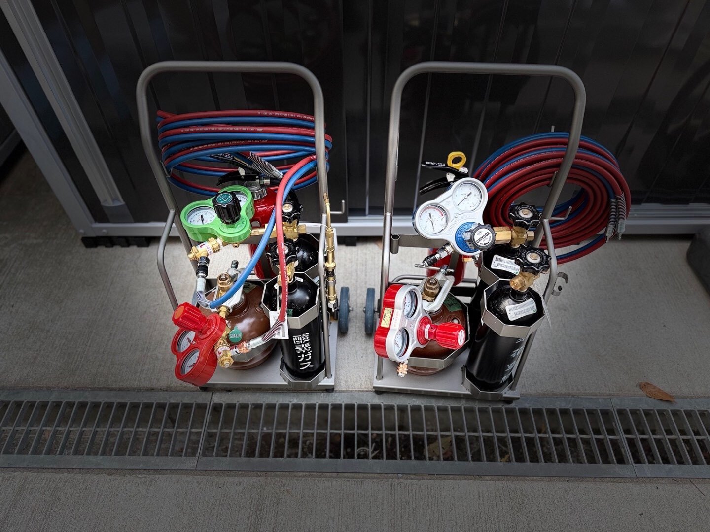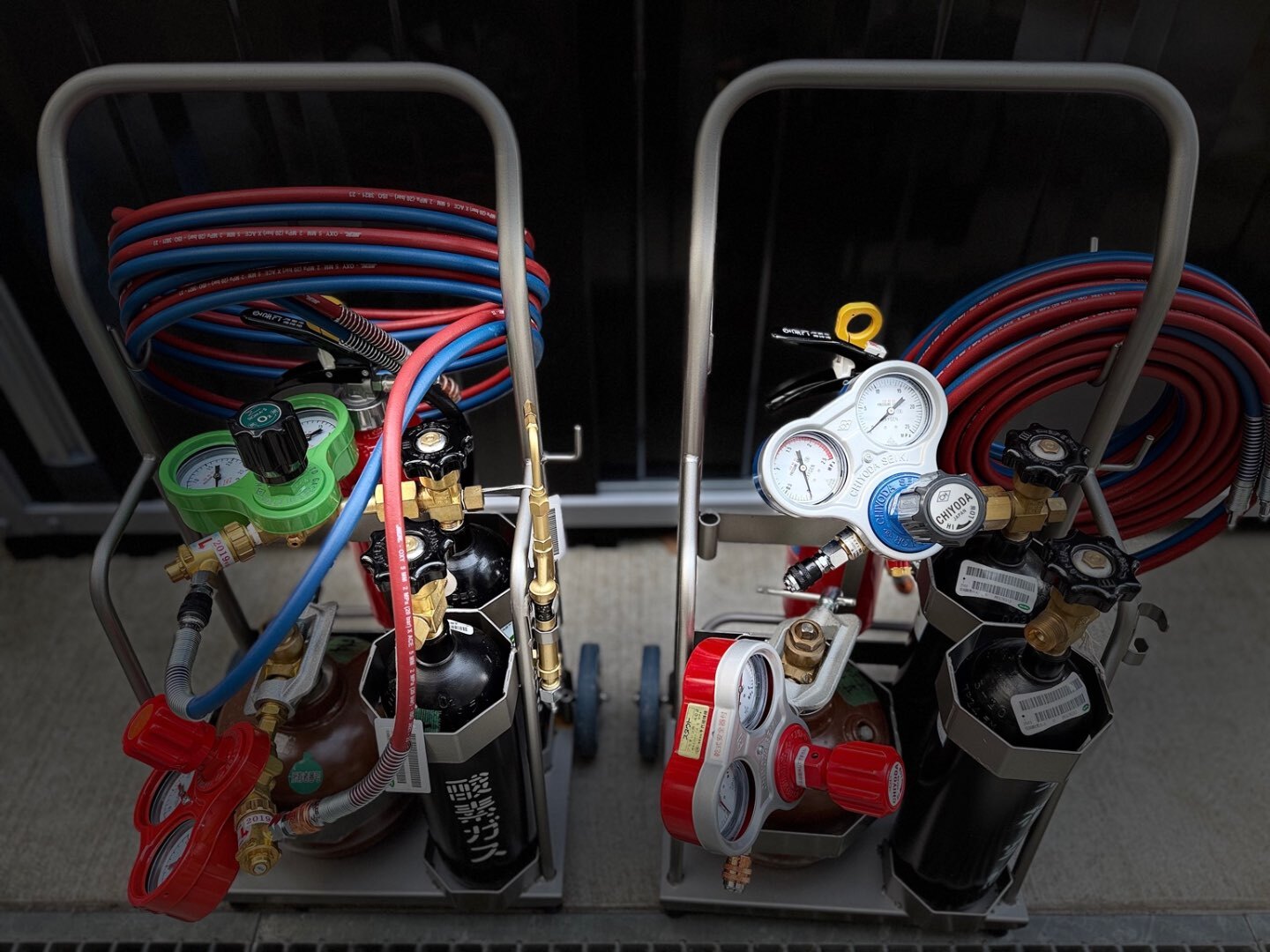 ボンベやホース、調整器類も専用台車に整理して搭載しています。