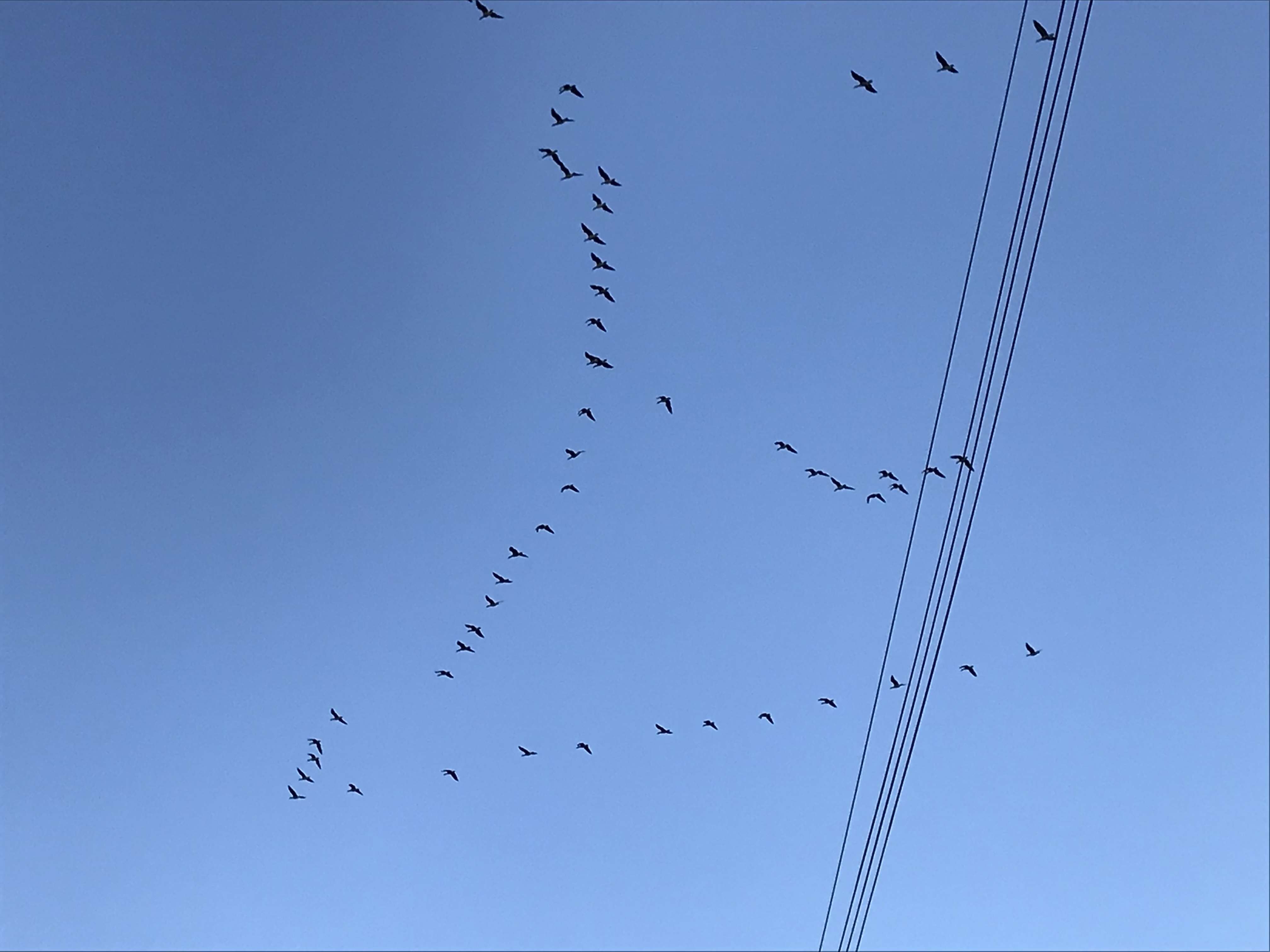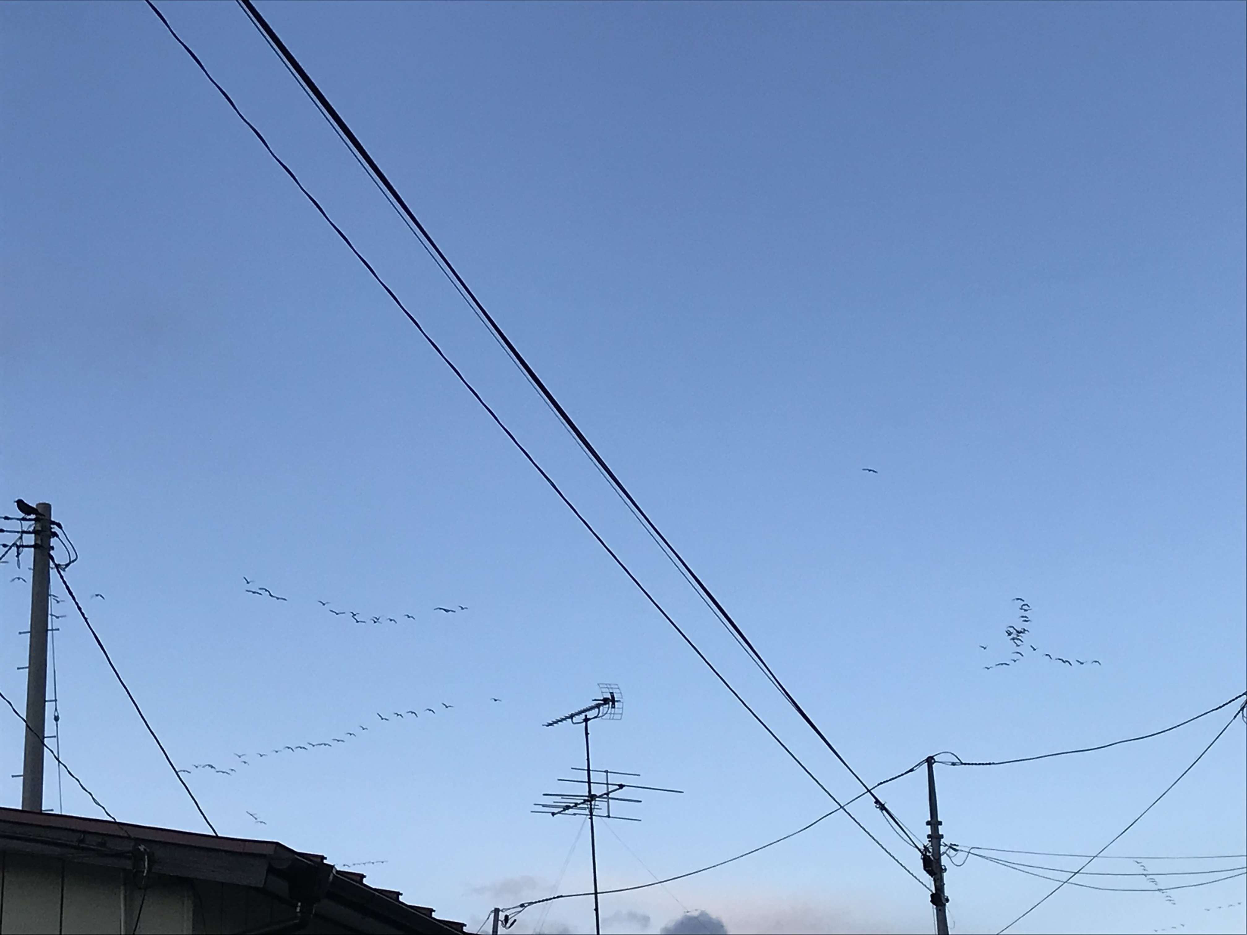先頭の鳥の後ろにきれいに並んだ鳥がどこかにかえっていくーっ!
