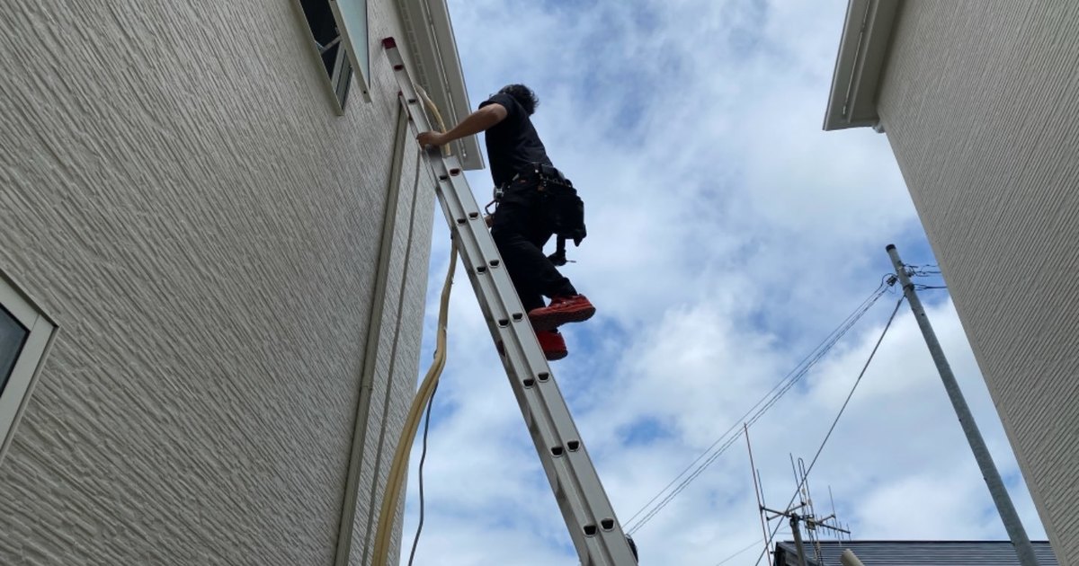 ご主人様の希望で入り口正面付近には室外機を置きたくないとご希望いただき、2階エアコンは配管を横に伸ばしてのベランダ置きに設置させていただきました!(๑´ω`ノノ゙✧