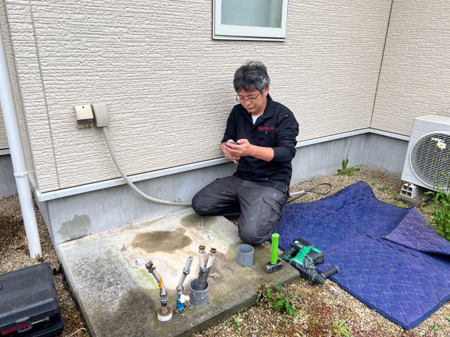 花に囲まれてエコキュート設置作業も順調です!☺️💐