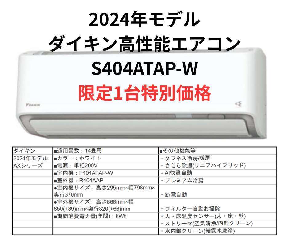 高性能なダイキン製エアコン、S404ATAP-Wを1台限定で、特別価格にてご提供いたします!