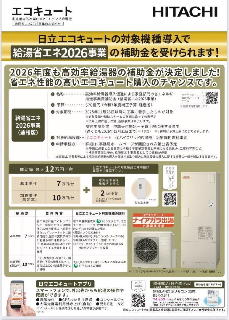 特に、10年以上お使いの給湯器(エコキュート・電気温水器など)をお持ちの方に、今すぐお伝えしたいビッグニュースがあります。2026年度もエコキュート導入に対する国の強力な補助金制度「給湯省エネ2026事業」の実施が決定しました!