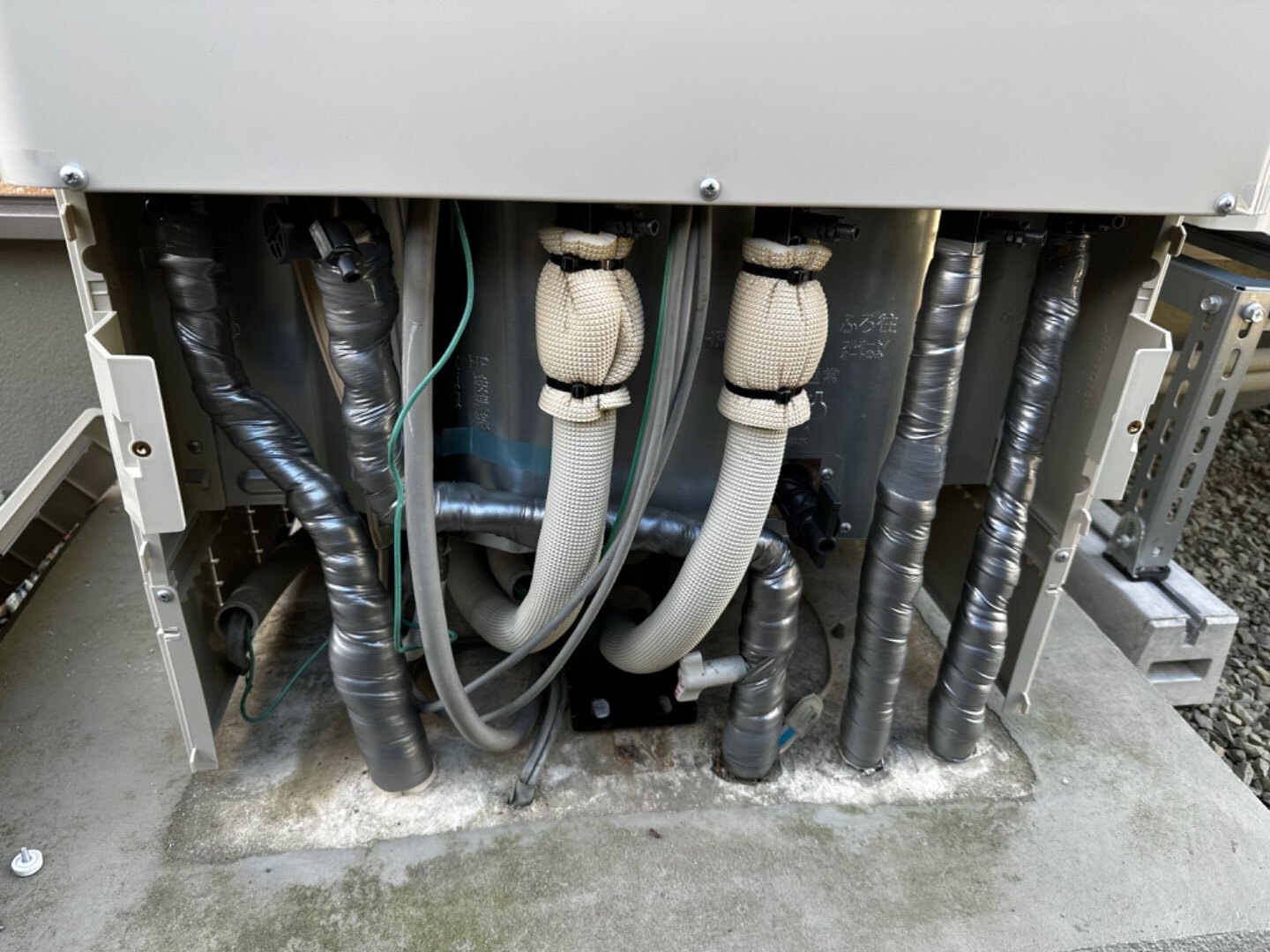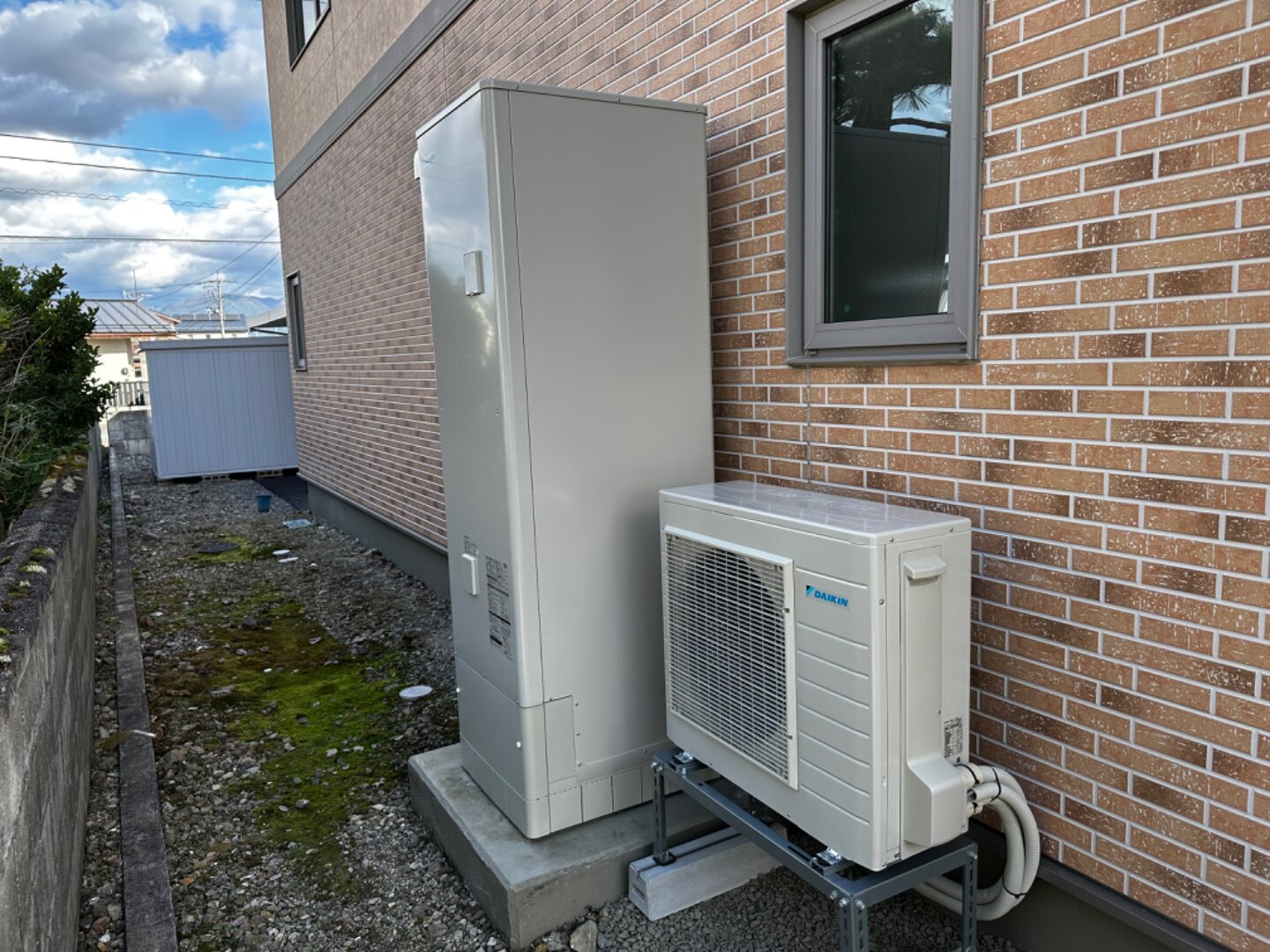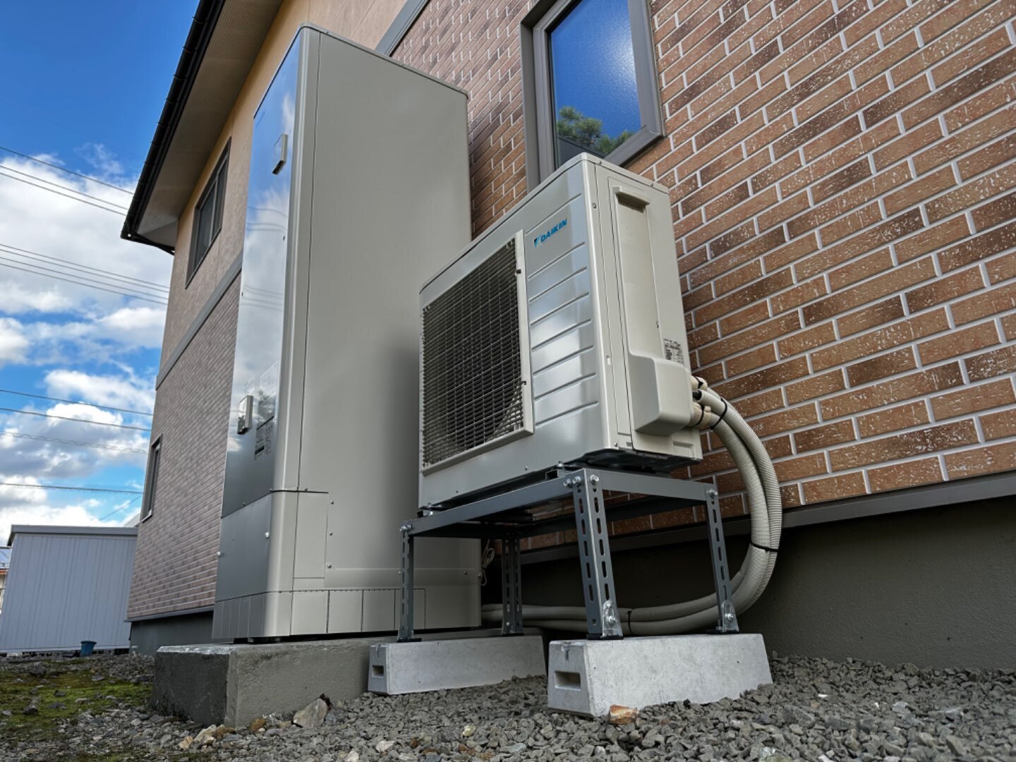 アンカーを打ち終わり、エコキュートを建てて、配管を繋ぎます🤝