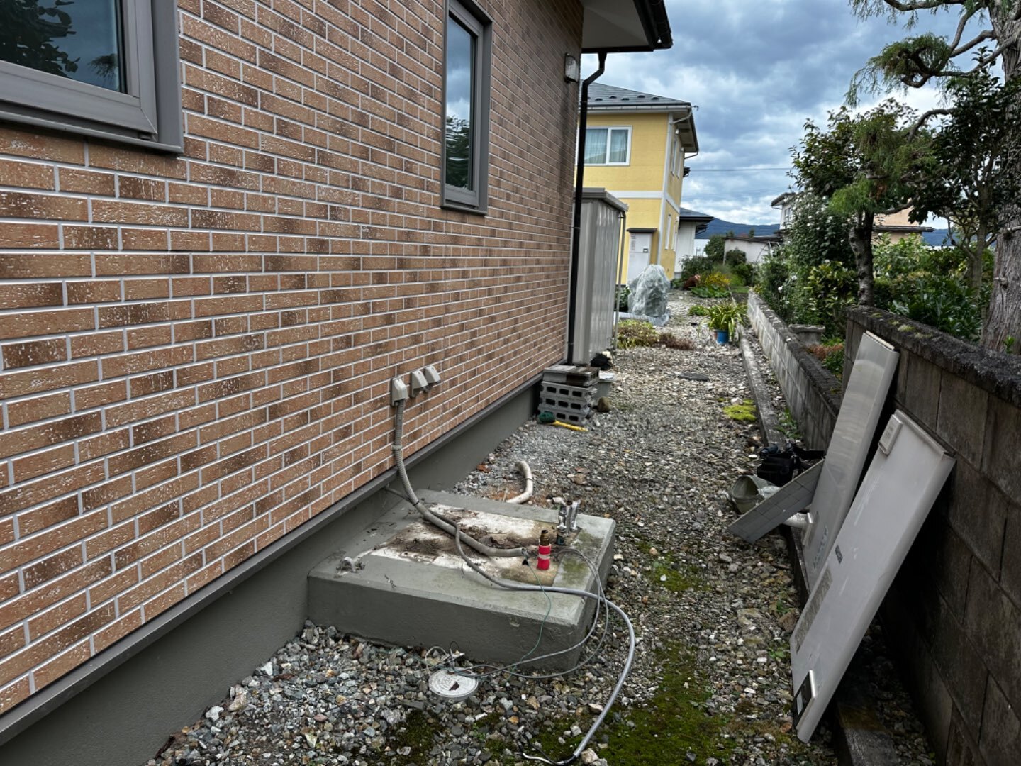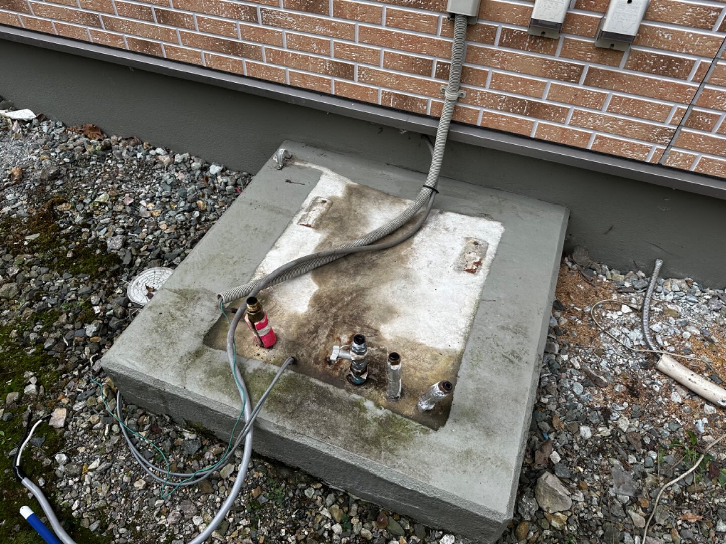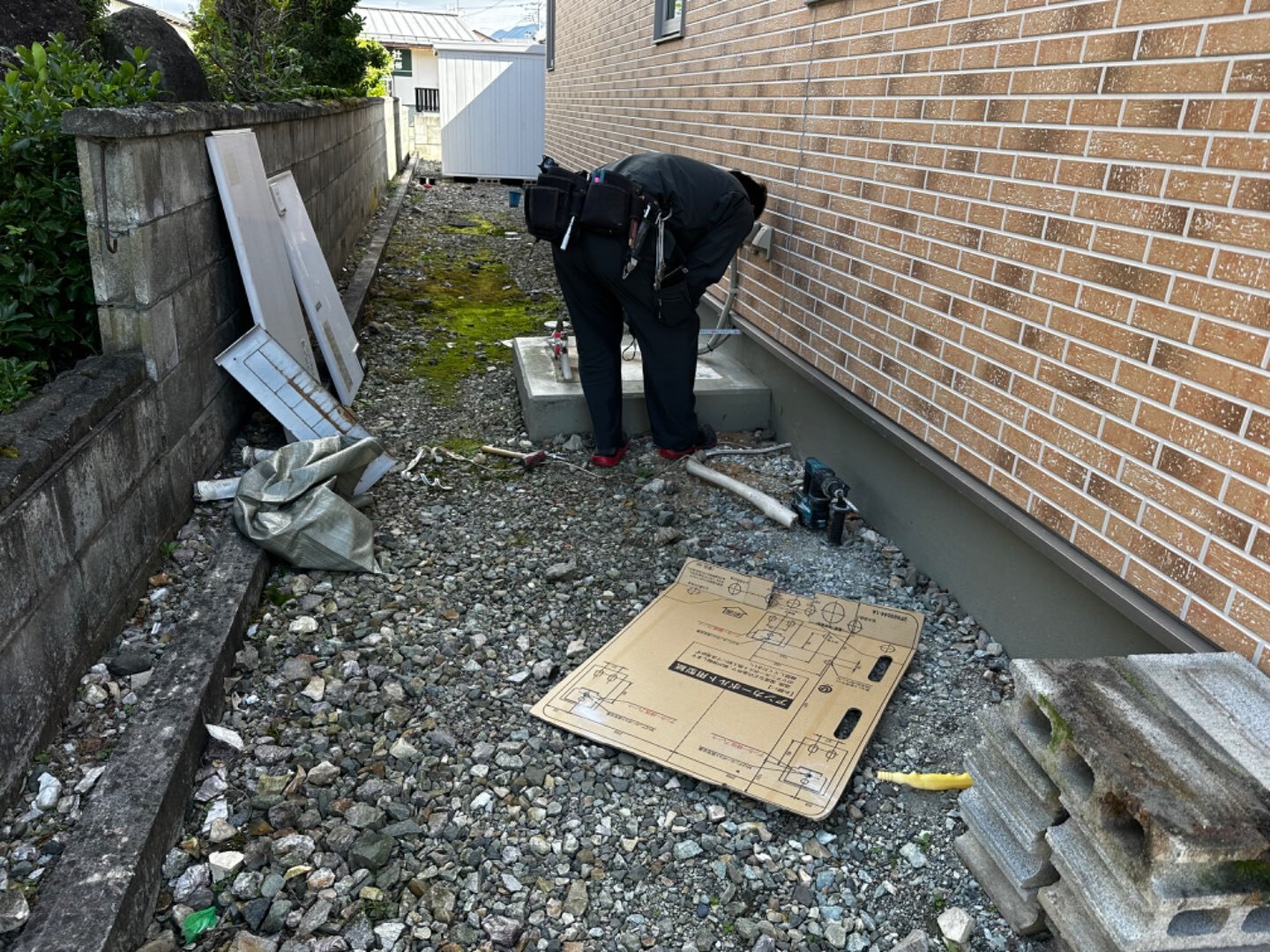 アンカーを打ち終わり、エコキュートを建てて、配管を繋ぎます🤝