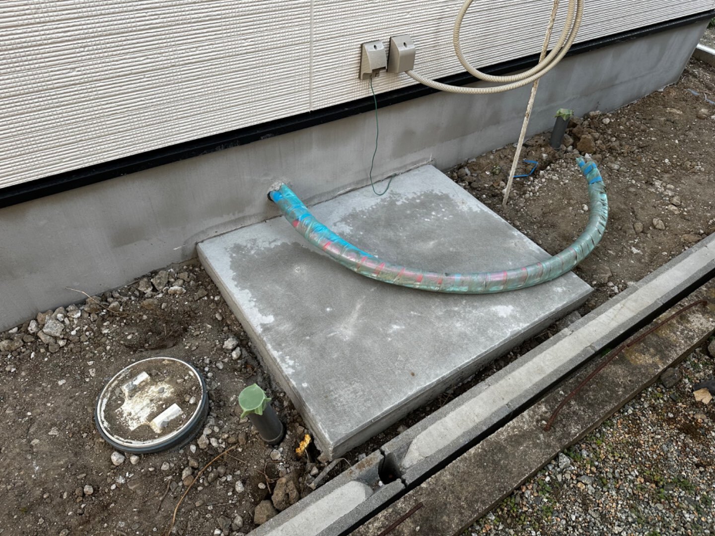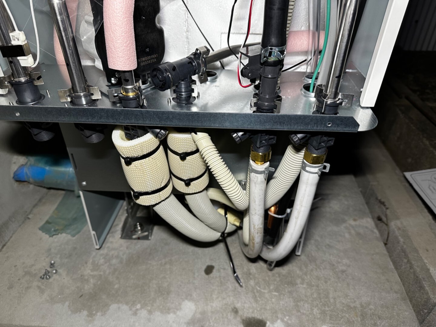 ヒートポンプを設置し、配管と電線を繋ぎました‼️