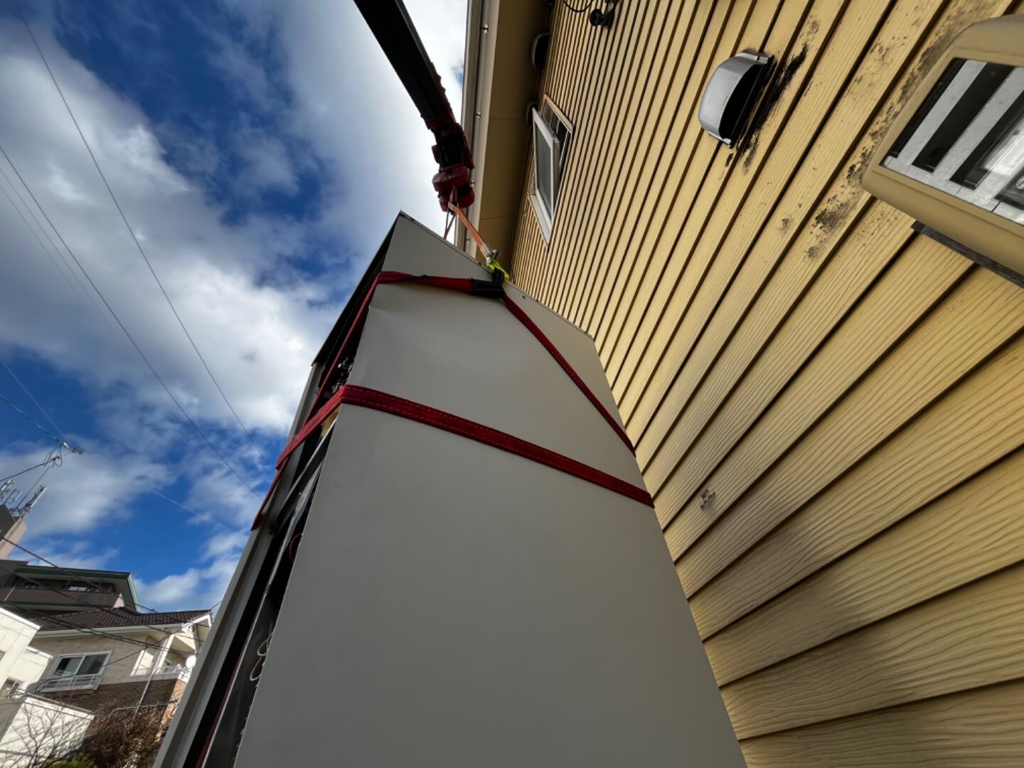 お家の外壁などに当たらないようにみんなで声掛けをしながら慎重に運び出しました🏗️