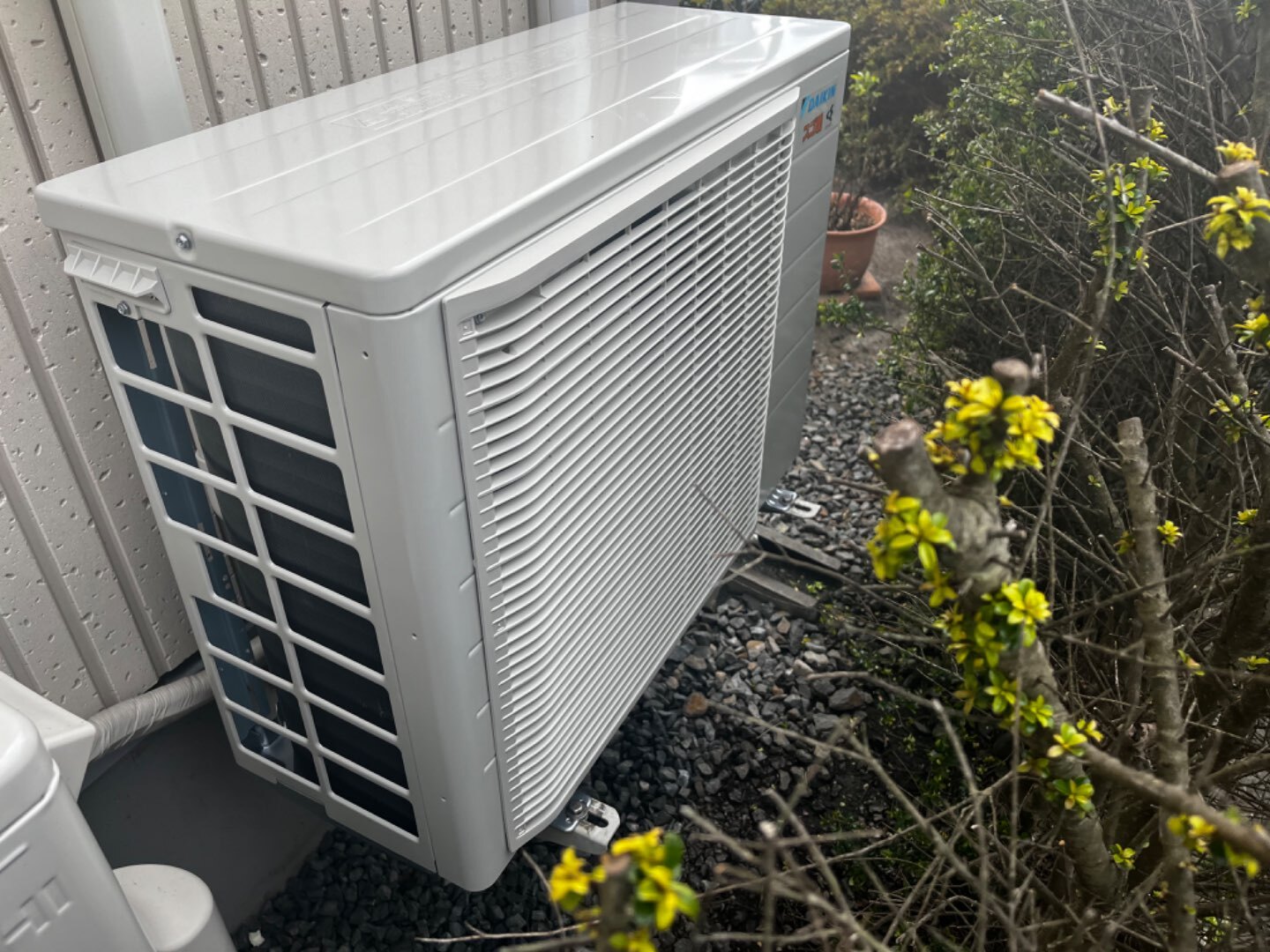新しい室外機は、ブラケットでしたので、しっかり足場を合わせて〜