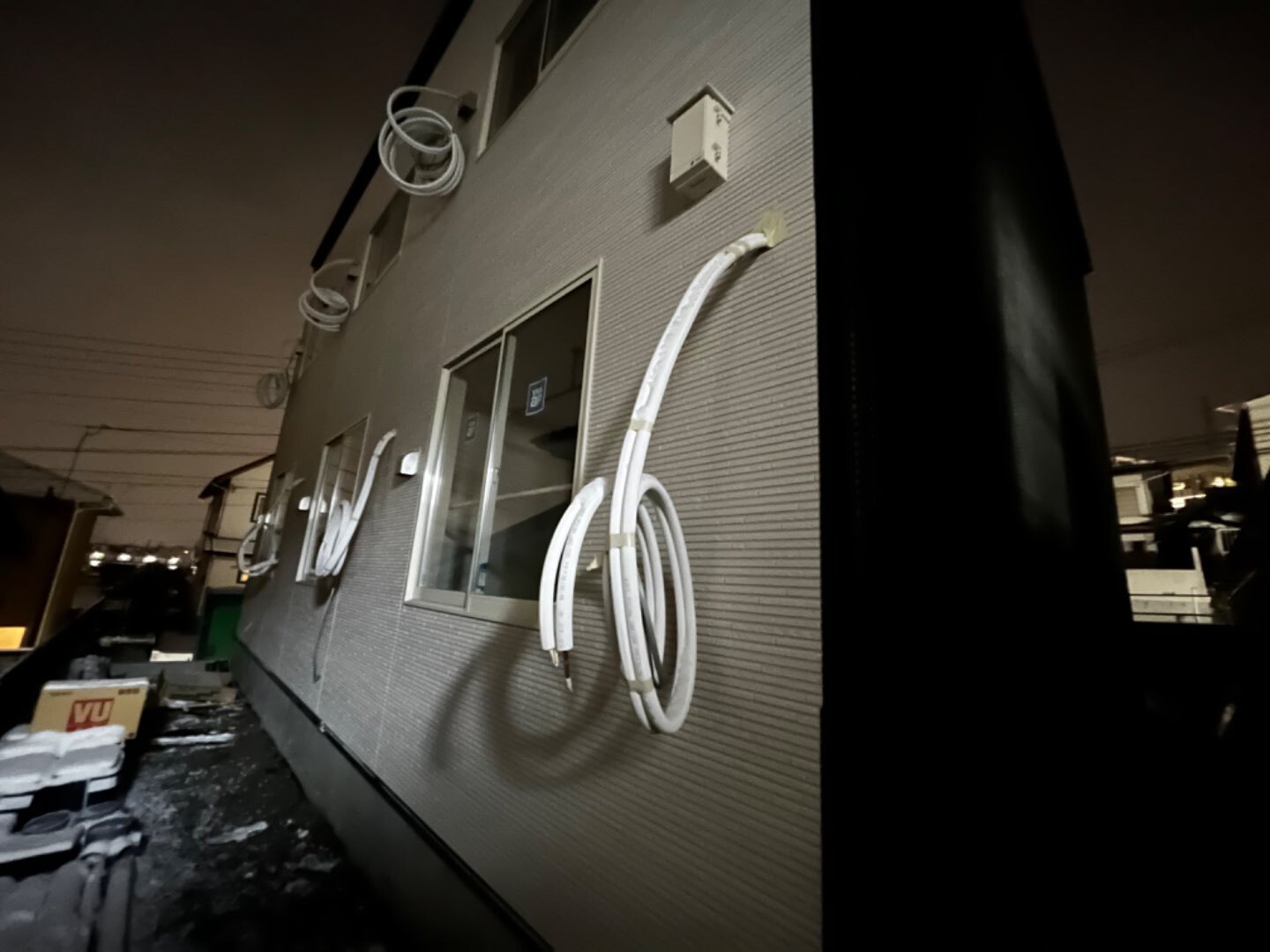 工事途中と事で、室外機は本日は据え付けできませんでしたが、いつでもできるように配管と電線とドレンを丸めておきました‼️