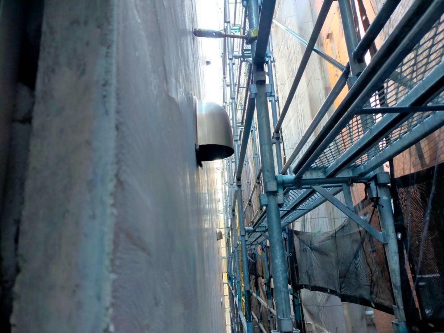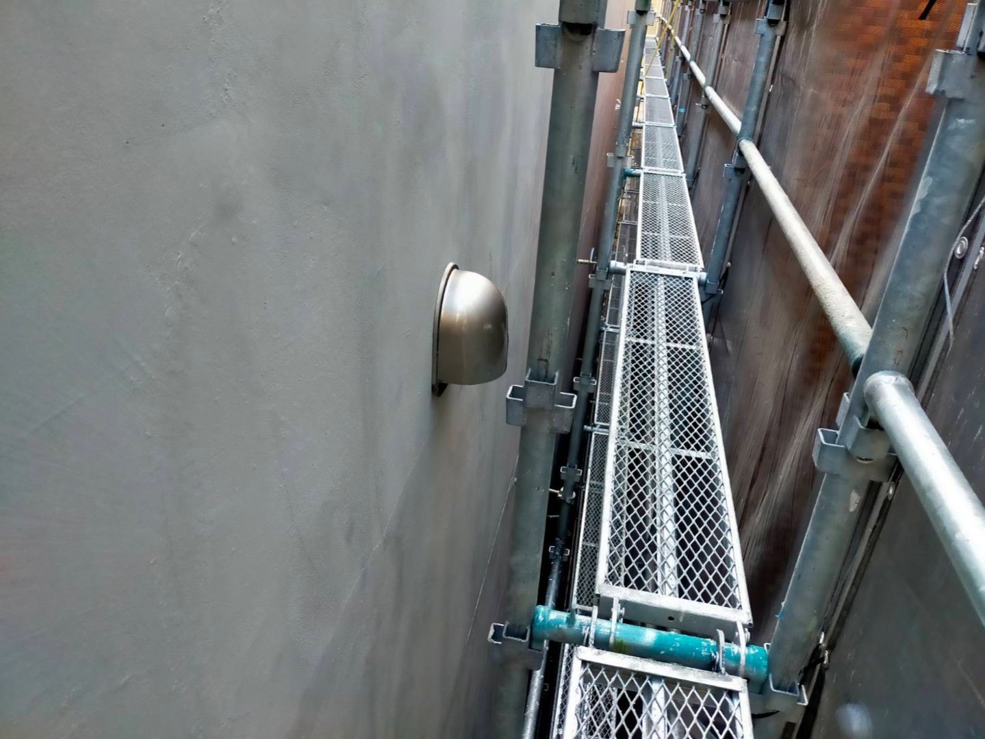 2.足場解体工事に伴う事前外部フード先行取付工事。