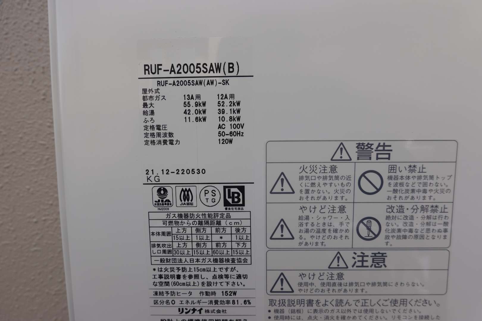 4.新規機器情報 リンナイ 壁掛型ガスふろ給湯器。