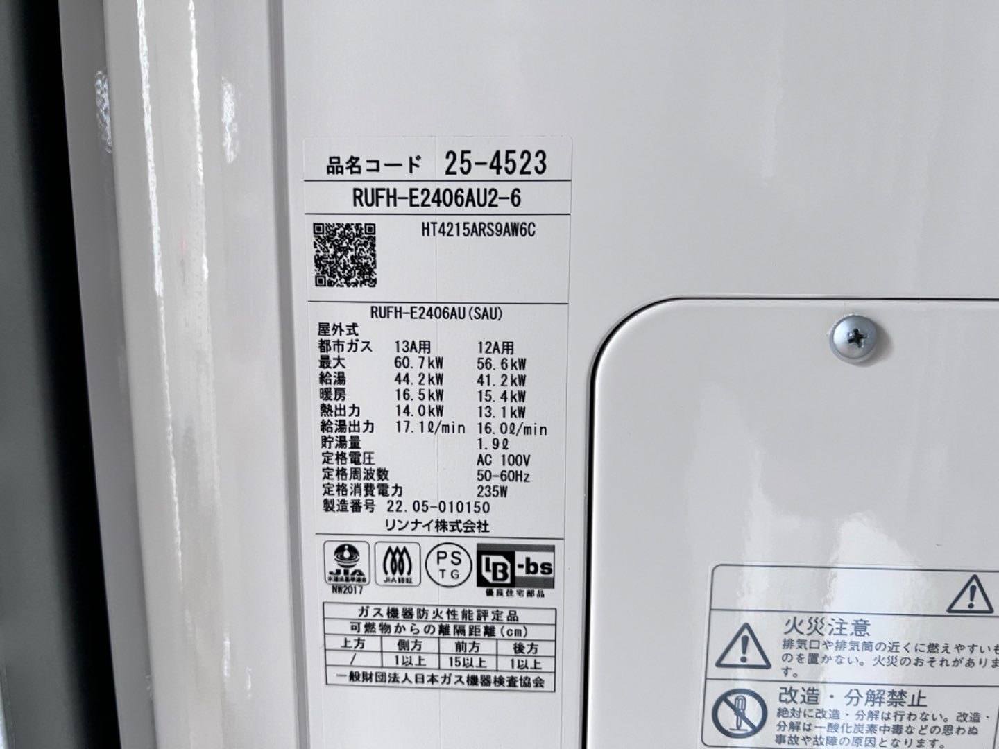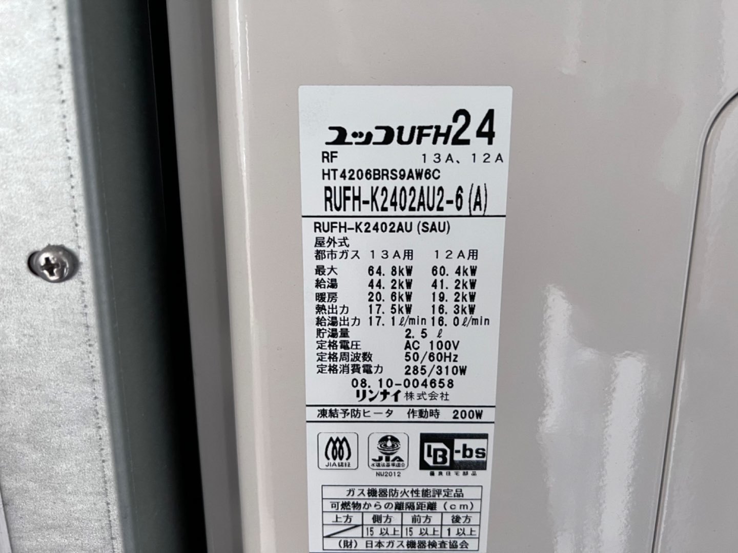 2.新規機器情報 リンナイ 24号扉内上方排気ガス給湯暖房熱源機