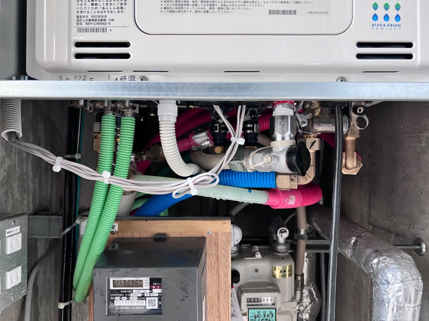 1.既存24号扉内上方排気ガス給湯暖房熱源機故障の為交換工事。