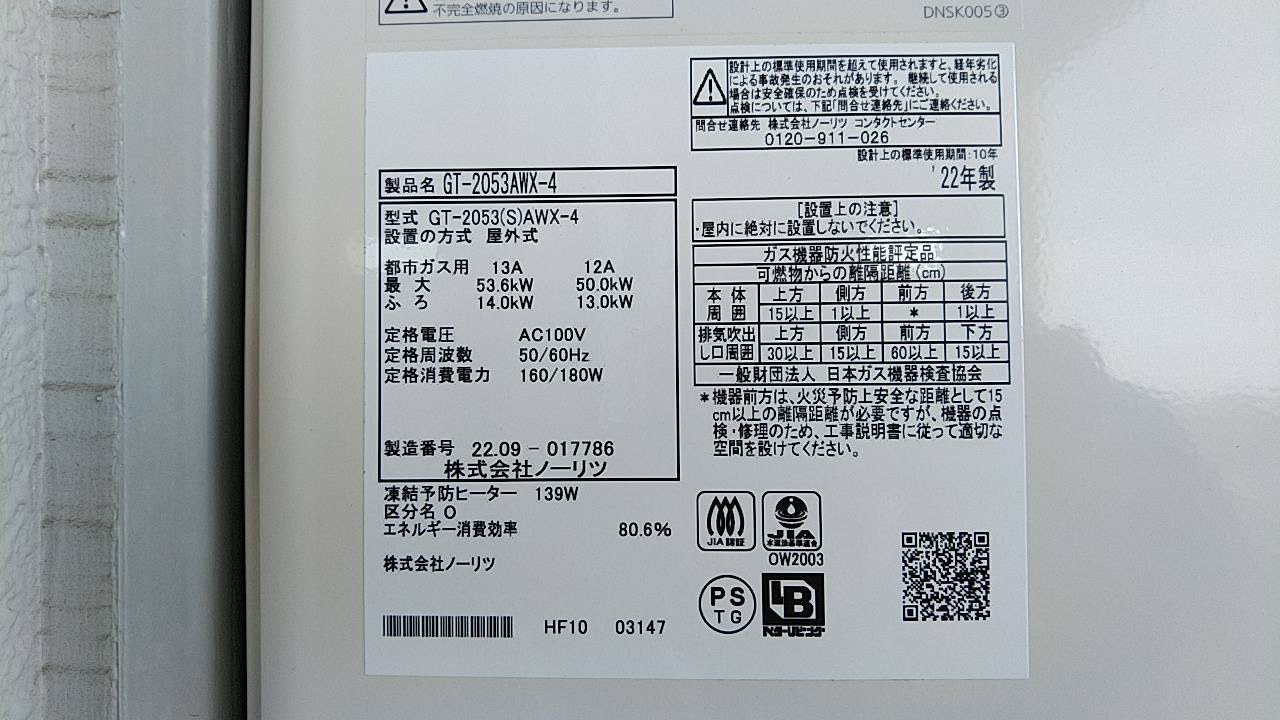 4.新規機器情報 ノーリツ製 ガスふろ給湯器。