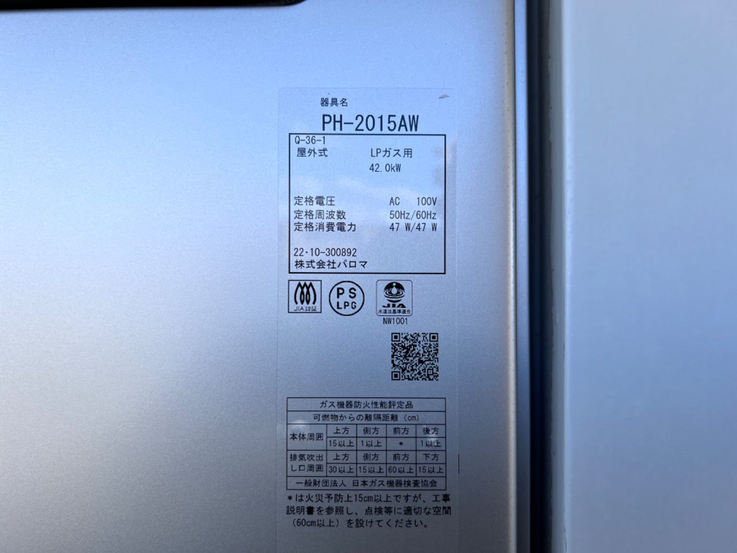 パロマ給湯専用ガス給湯器。