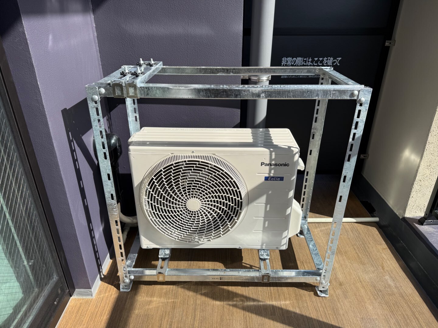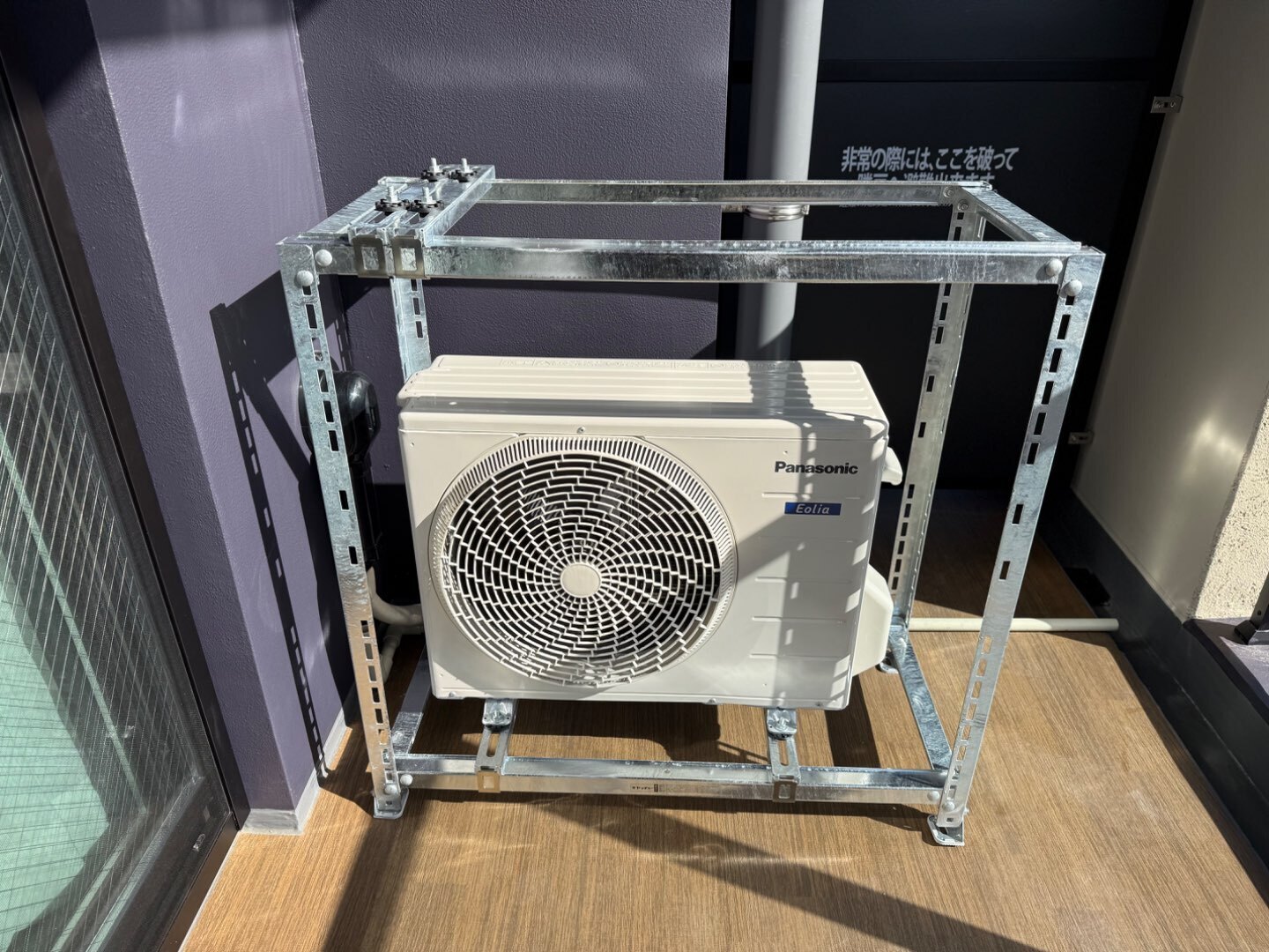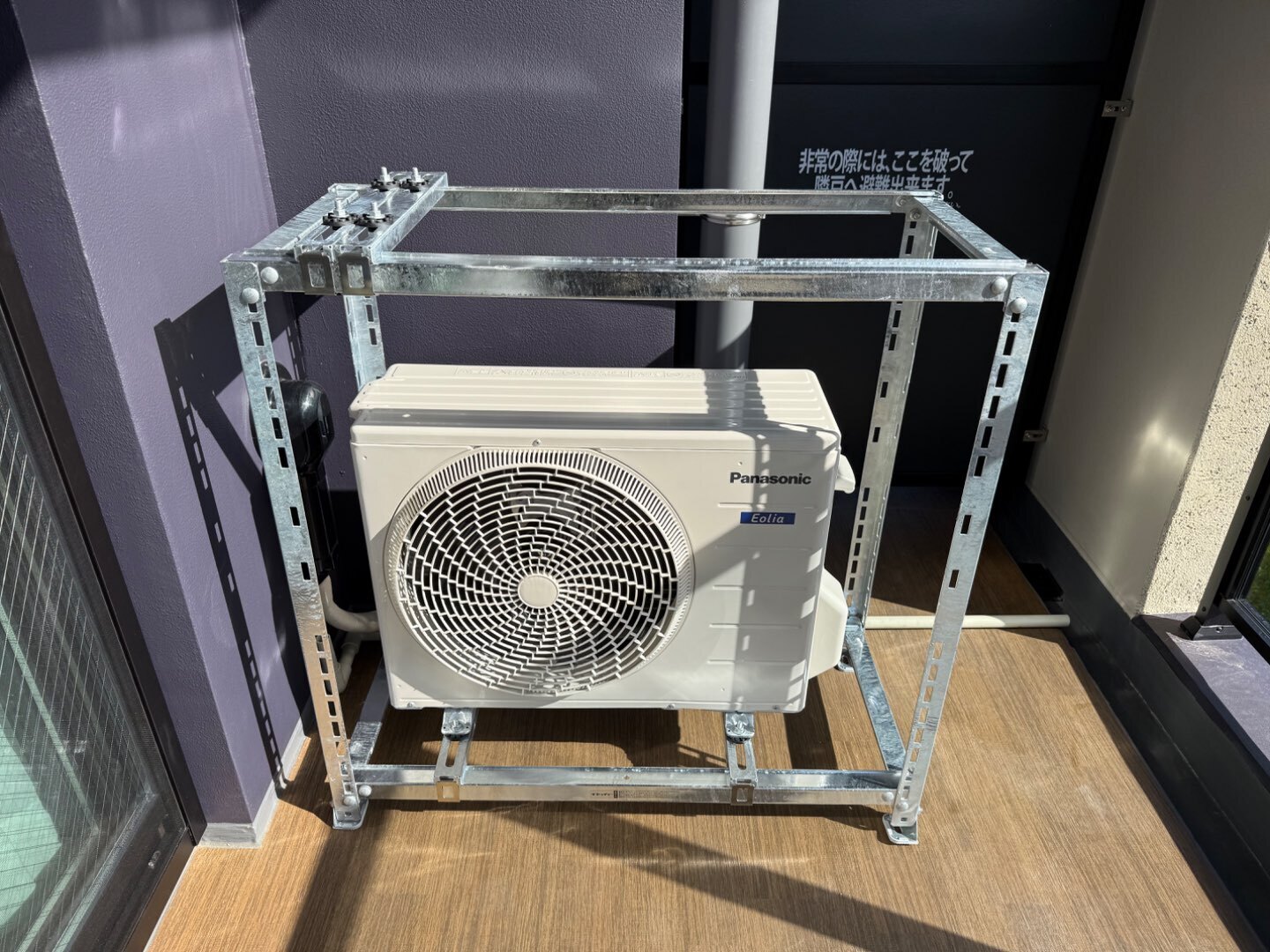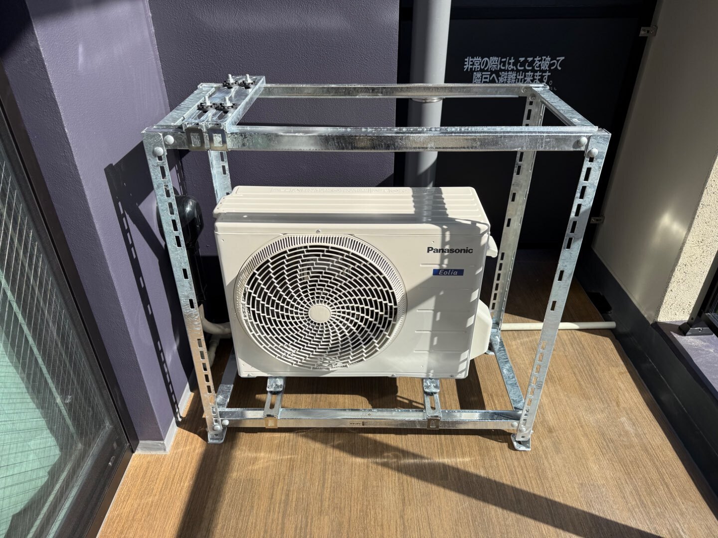 バルコニー設置のため、防振架台+固定ボルトで確実に水平を取り、