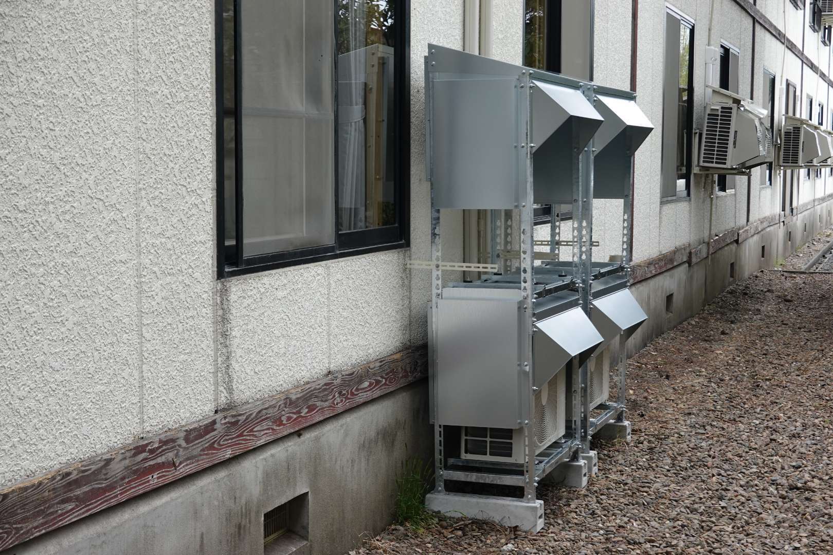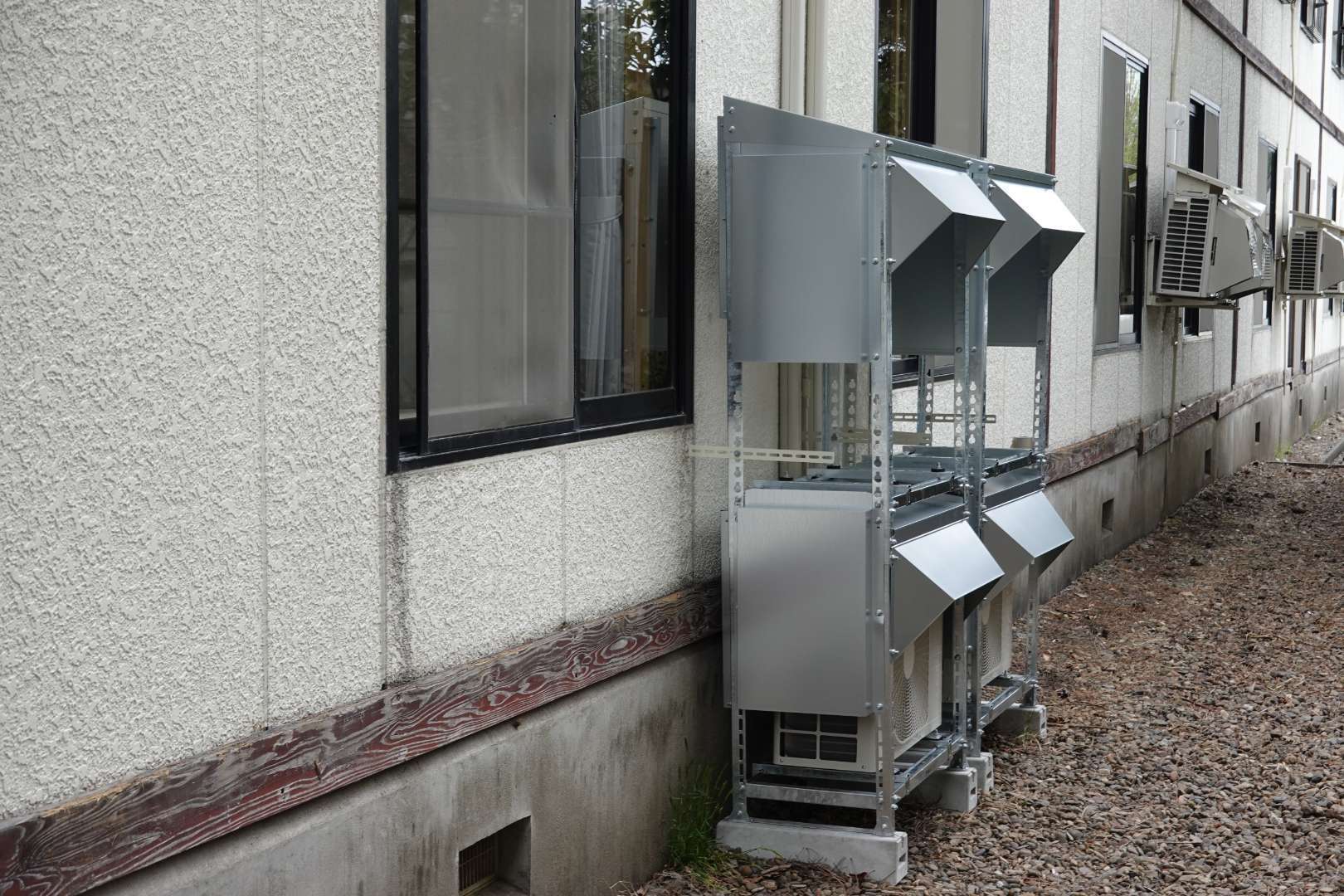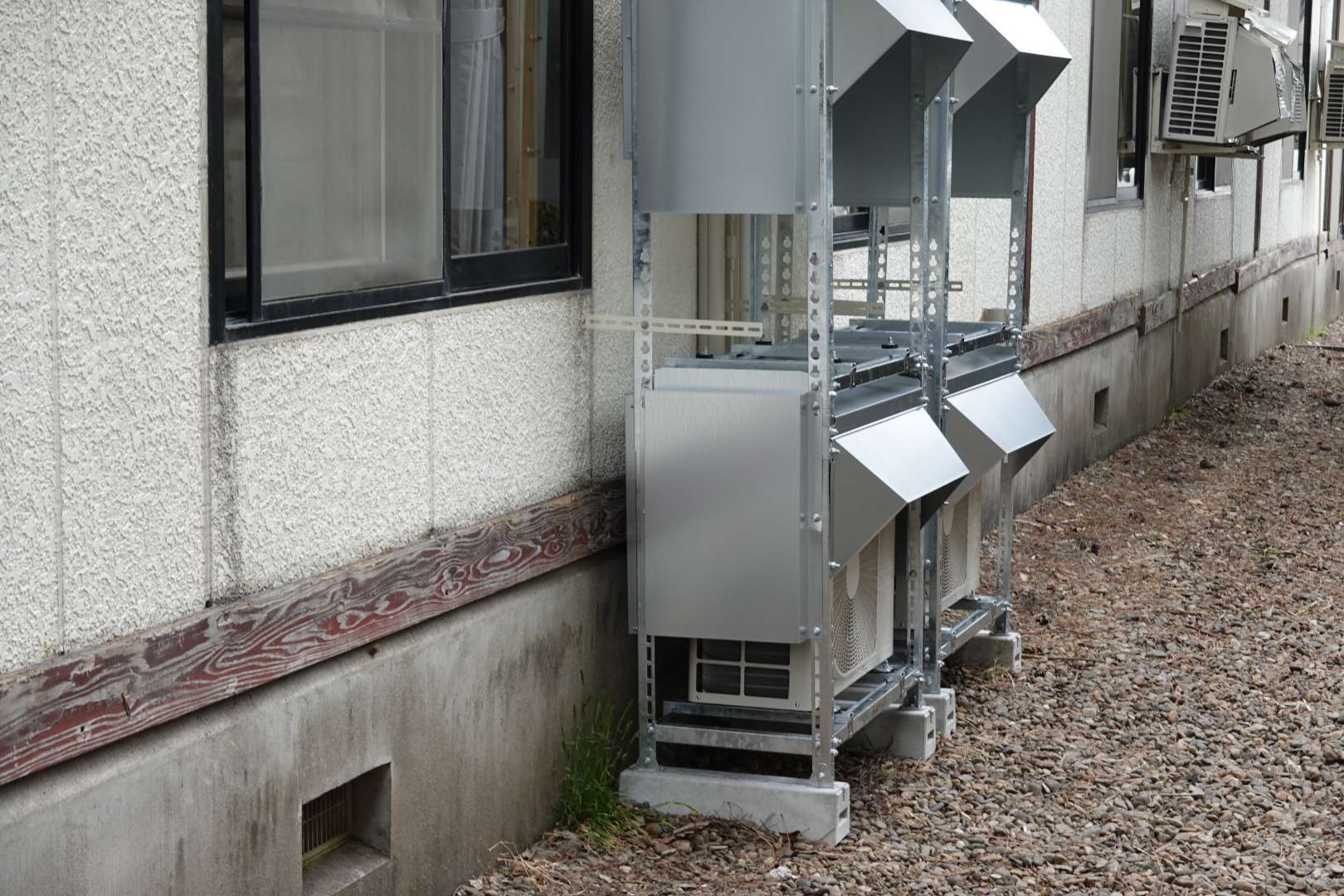 岩手県一関市厳美町 温泉旅館施設 三菱重工業製 ルームエアコン取付工事 防雪架台取付工事 二段架台取付工事