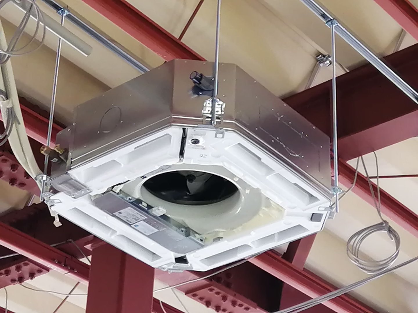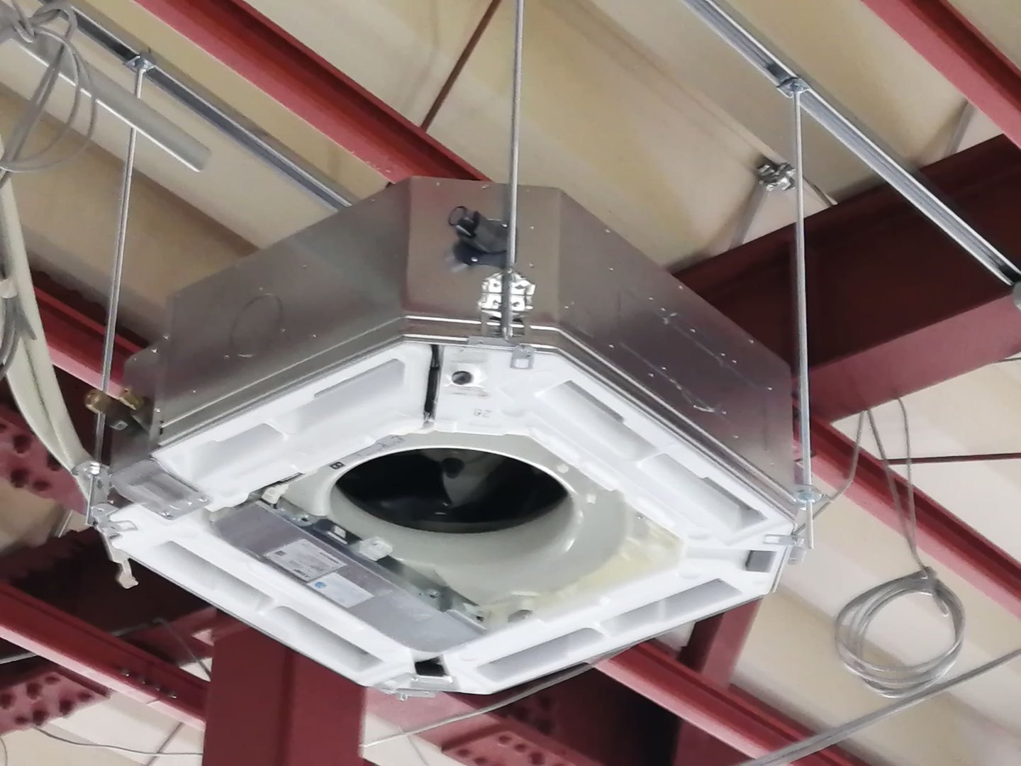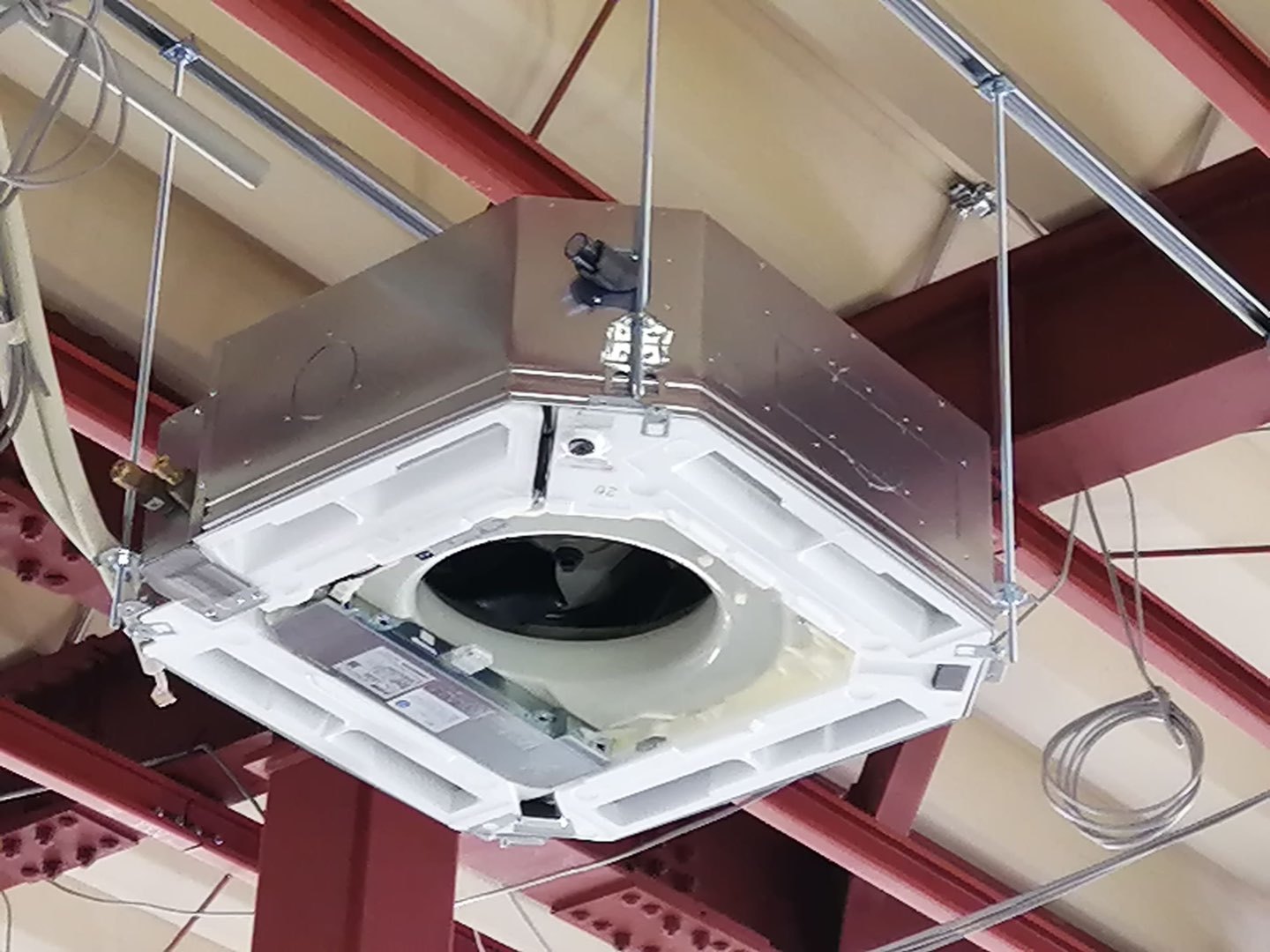 福島県伊達郡国見町 新築大型店舗現場様 三菱電機業務用エアコン 4方向カセット型室内機吊り込み工事