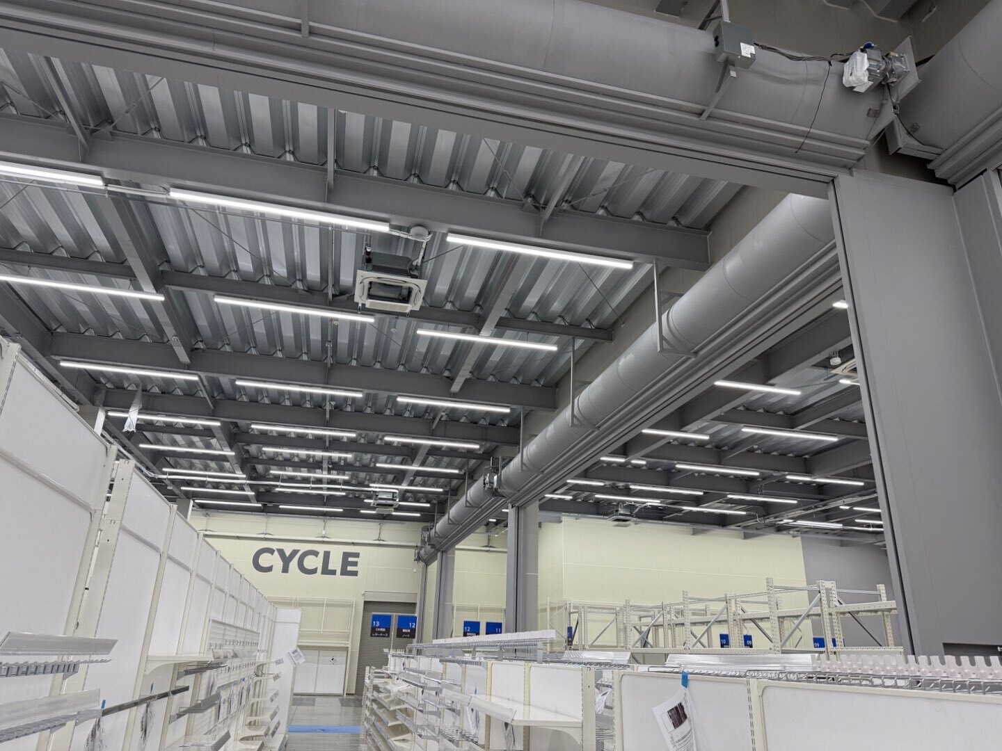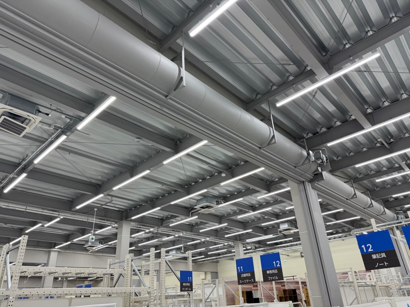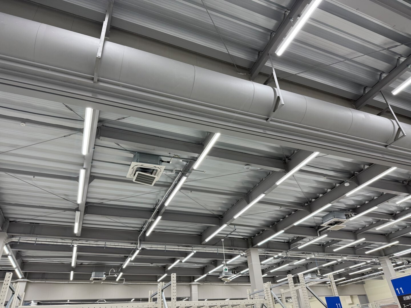 売り場全体に張り巡らされた大口径ダクト(外気・排気・換気)との干渉を避けつつ、