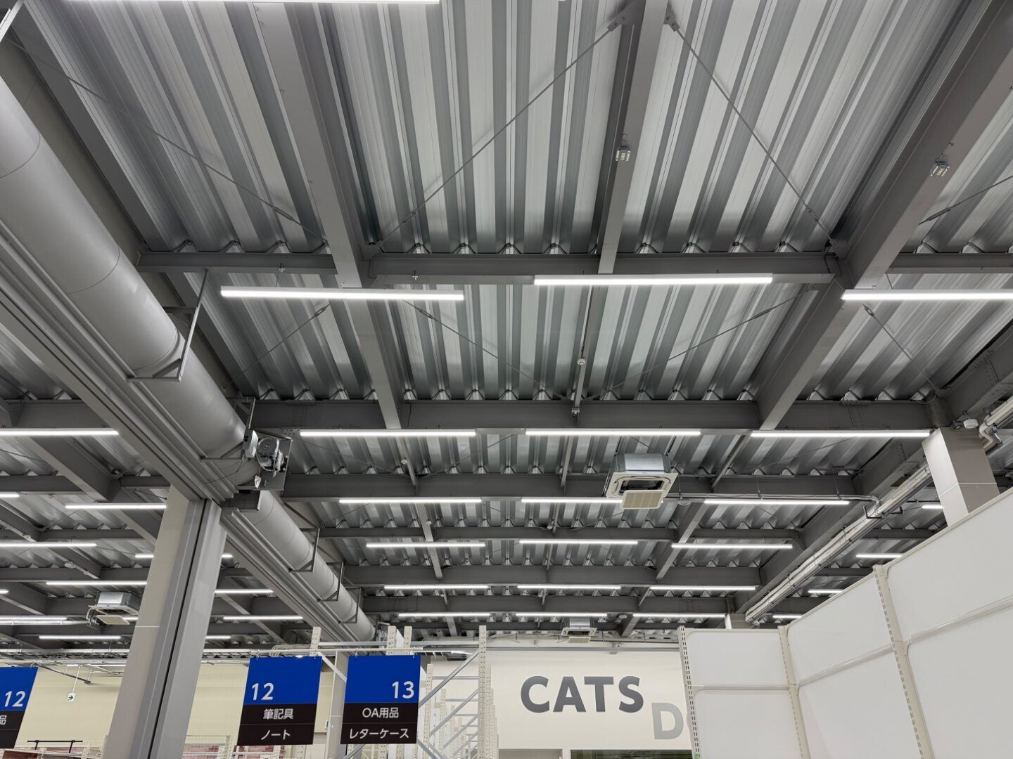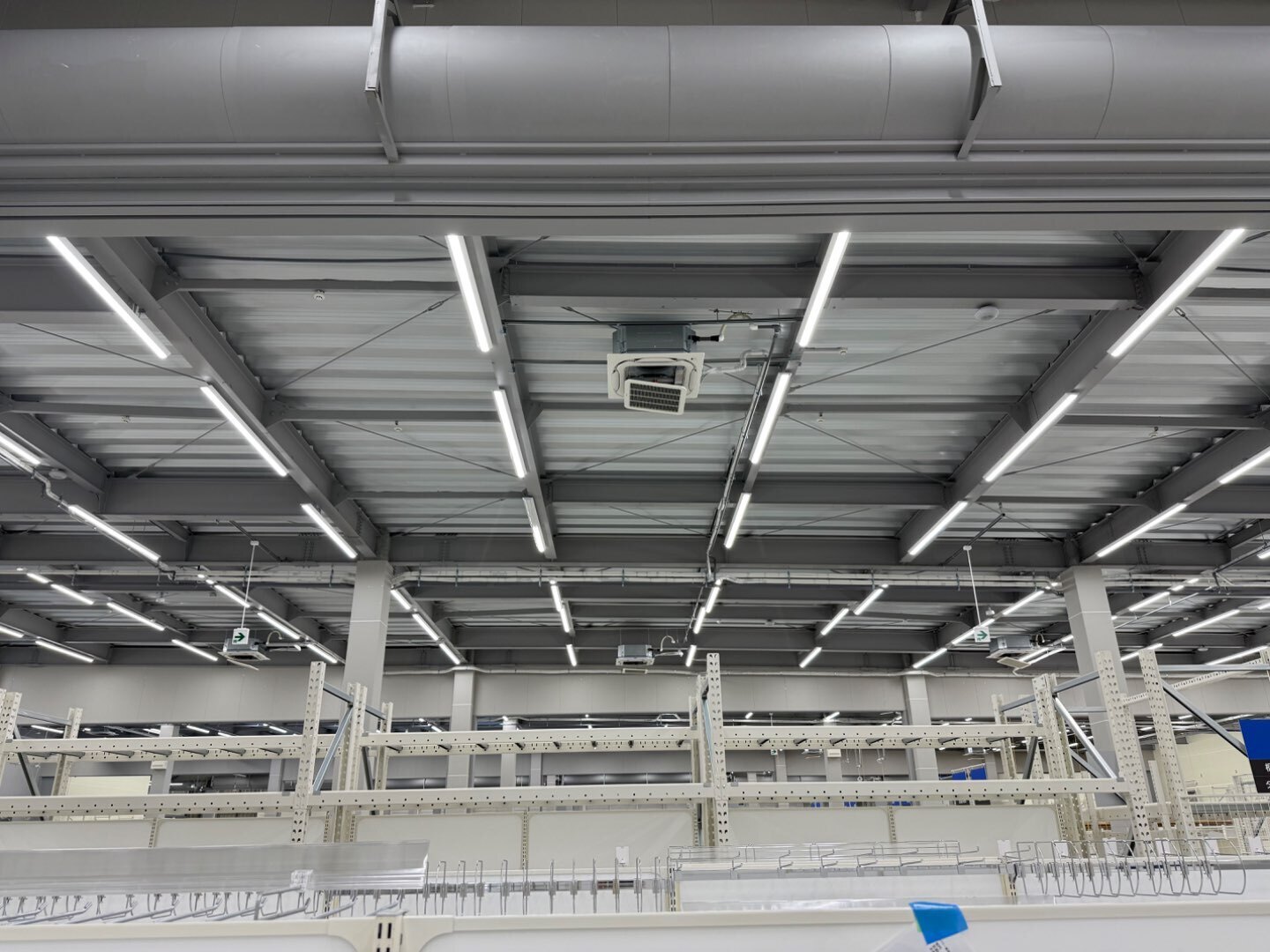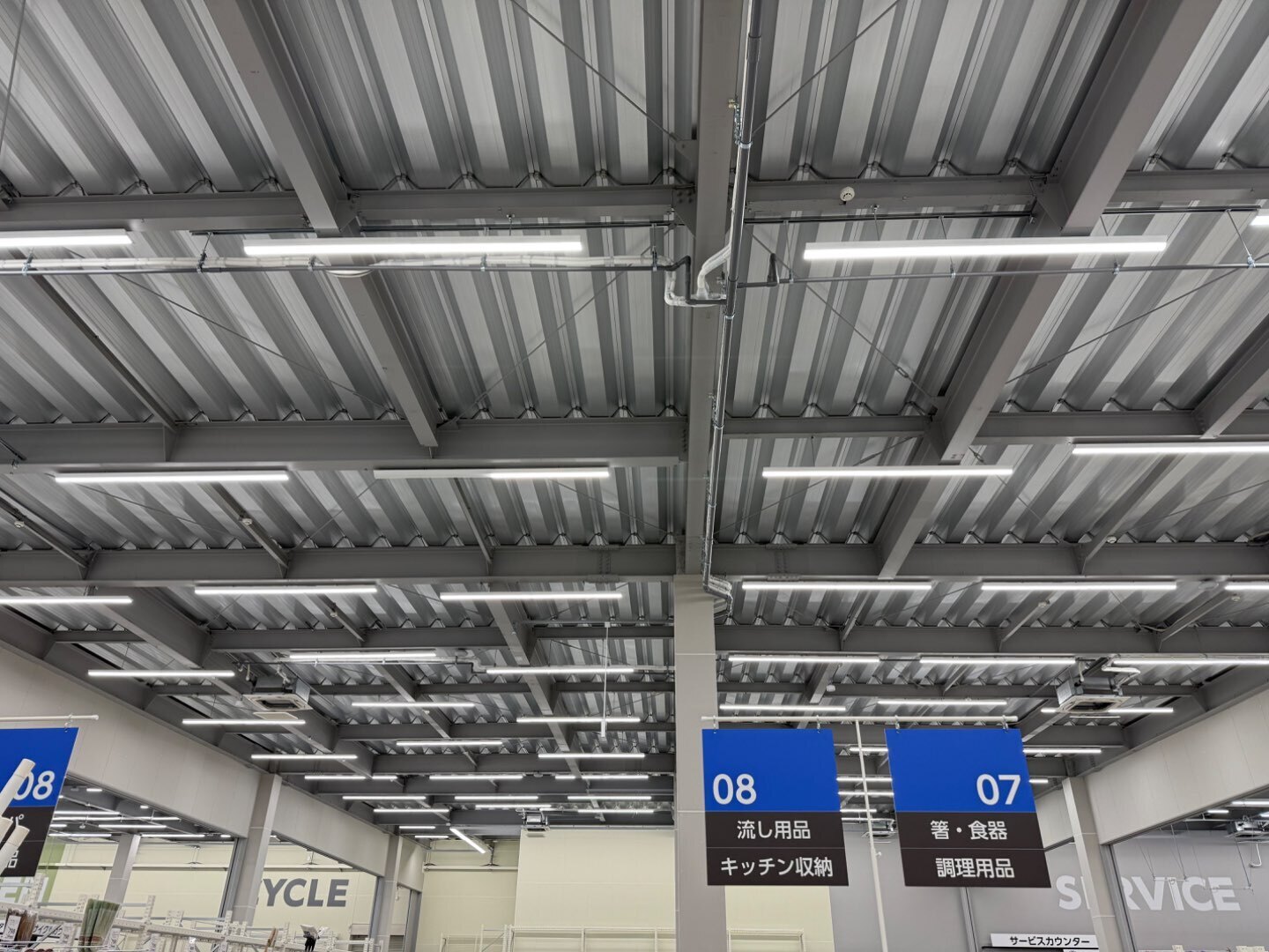 売り場全体に張り巡らされた大口径ダクト(外気・排気・換気)との干渉を避けつつ、