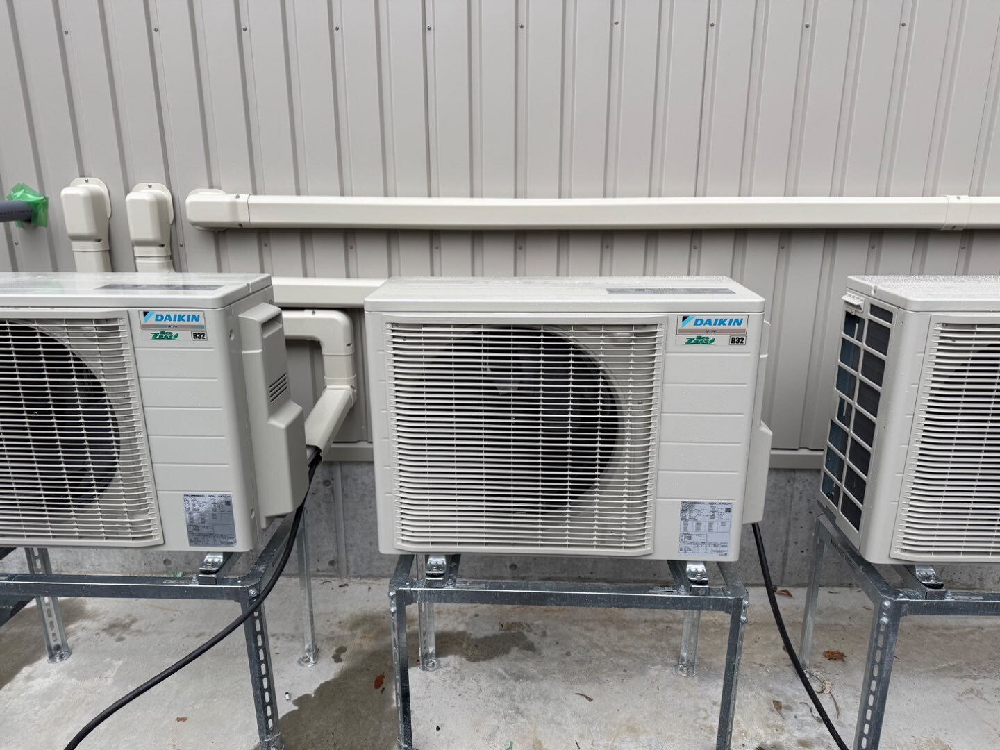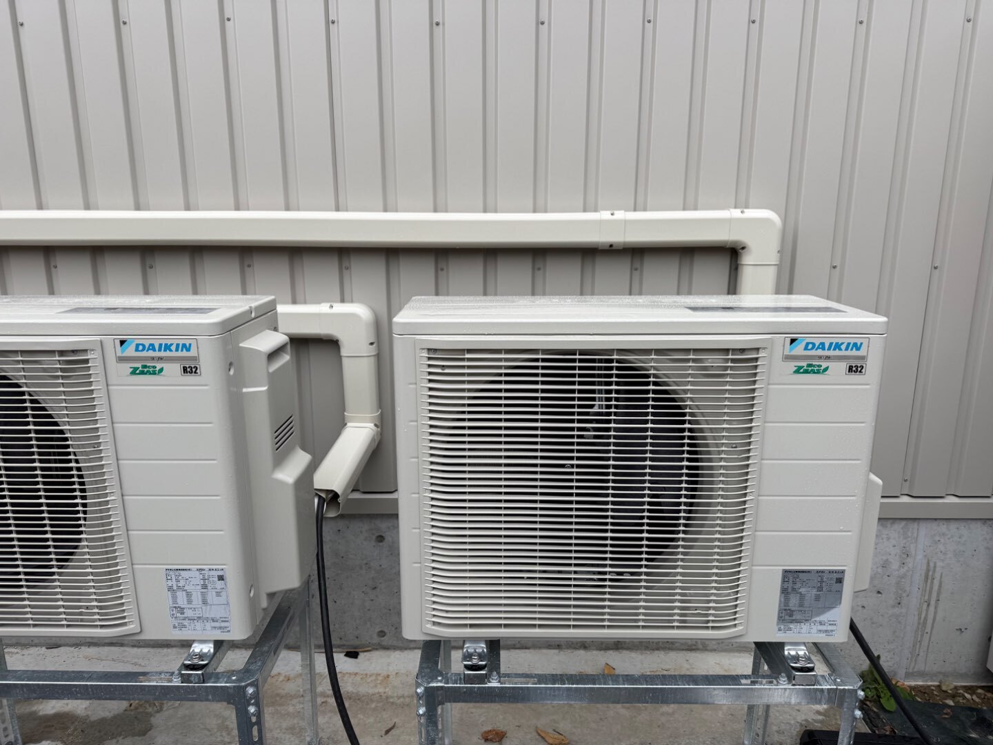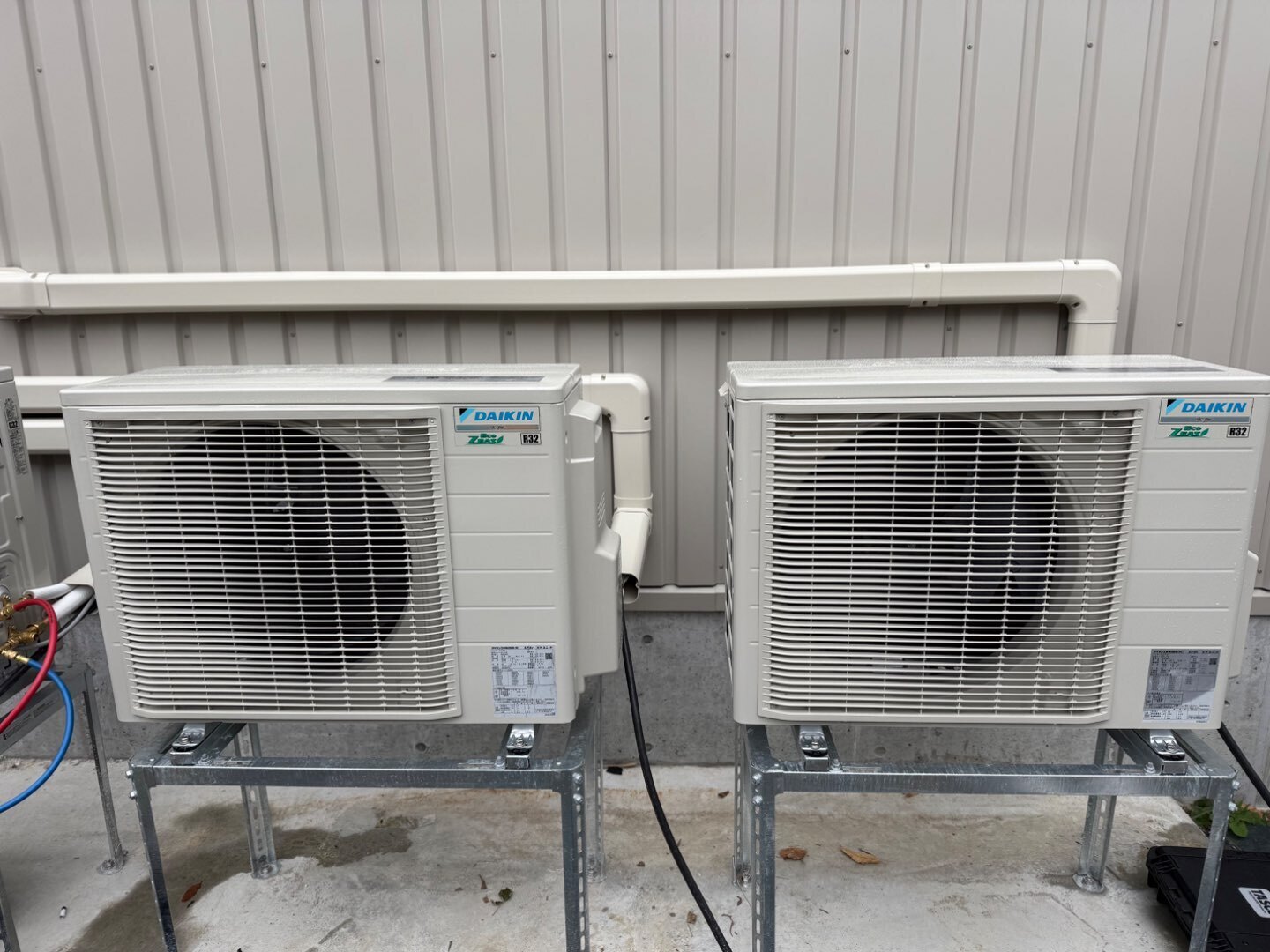 今回の現場では、ダイキン製ルームエアコン(R32)室外機の新規設置工事を行いました。