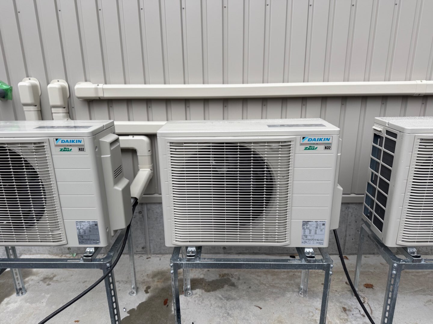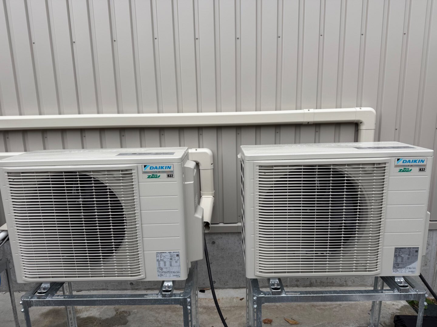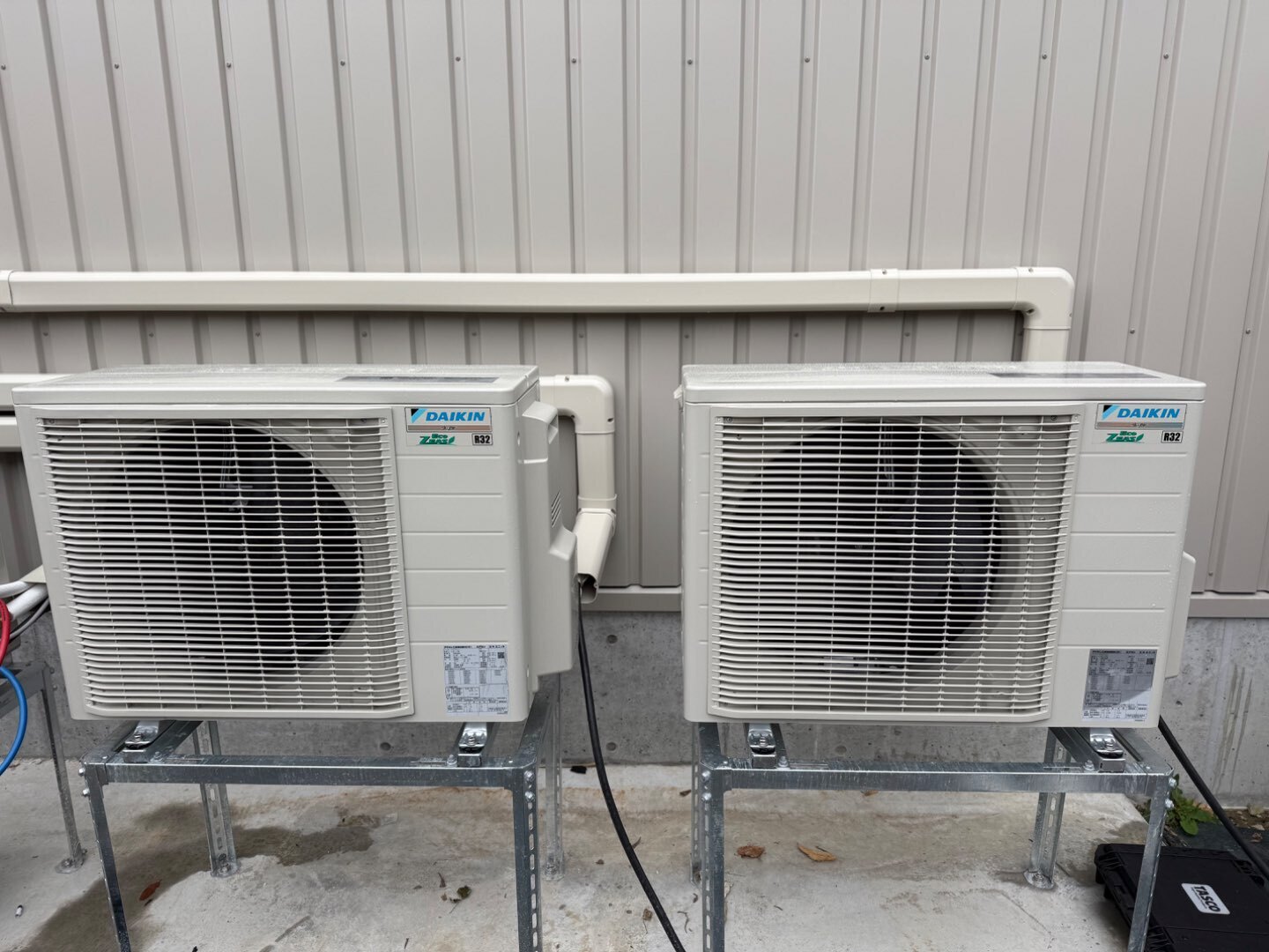 今回の現場では、ダイキン製ルームエアコン(R32)室外機の新規設置工事を行いました。