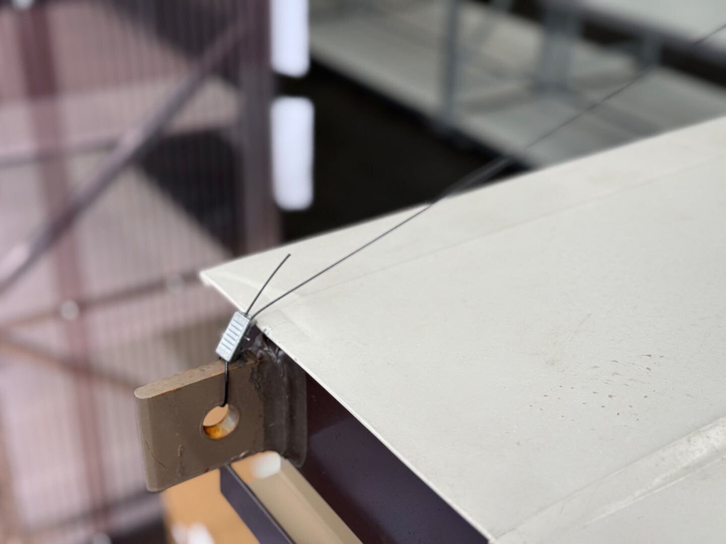 既存鉄骨の強度のある箇所を選び、屋根材を傷めない位置に緊結しています。