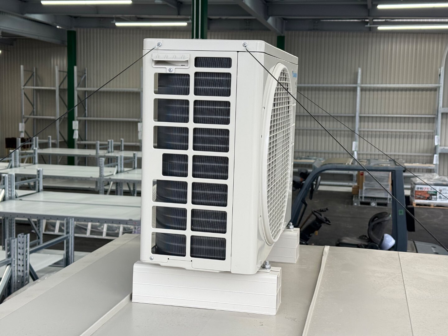 建物の構造上、一般的な“室外機を壁面近くに置く施工”が難しく、屋根上への室外機設置+ワイヤー固定による転倒防止対策 を組み合わせた、特殊な施工となりました。