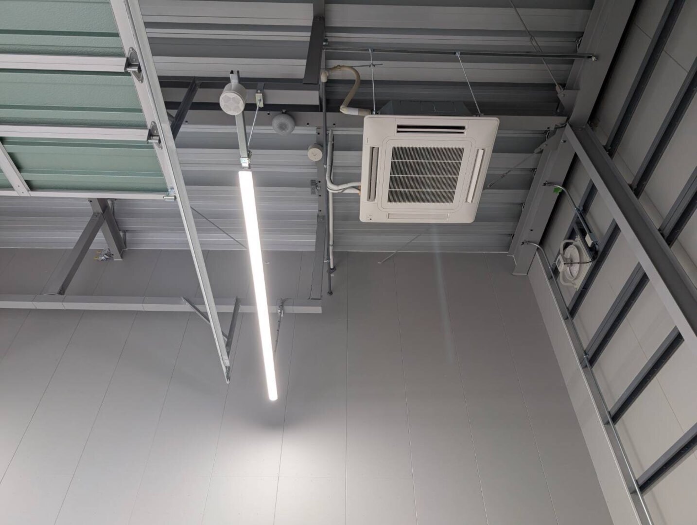 写真の通り、天井一面に整然と並んだ空調機・ダクト・照明により