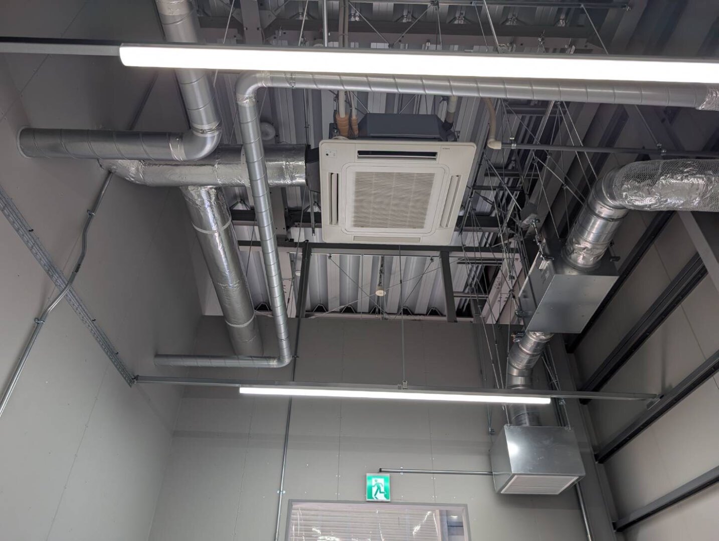 倉庫は天井高があり、荷物の出し入れ・フォークリフト走行なども考慮した空調設計が必須です。