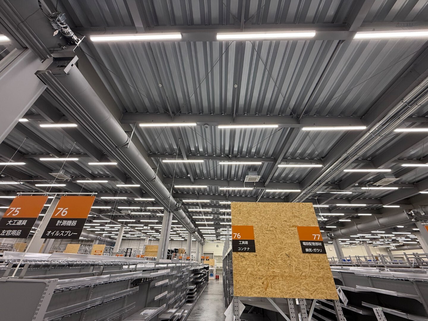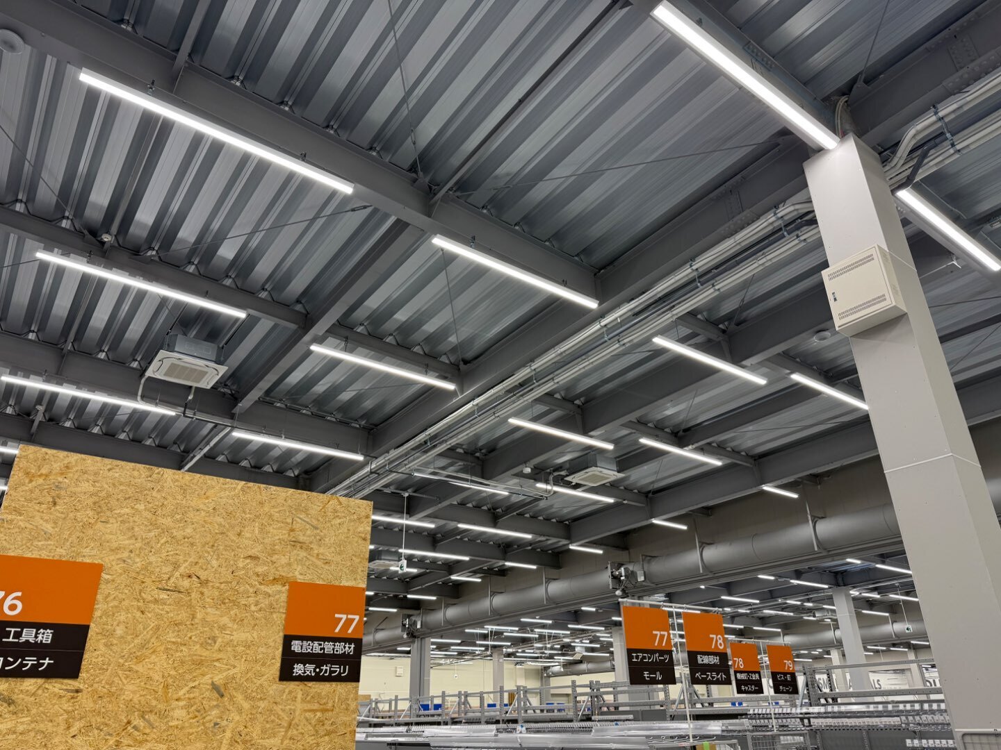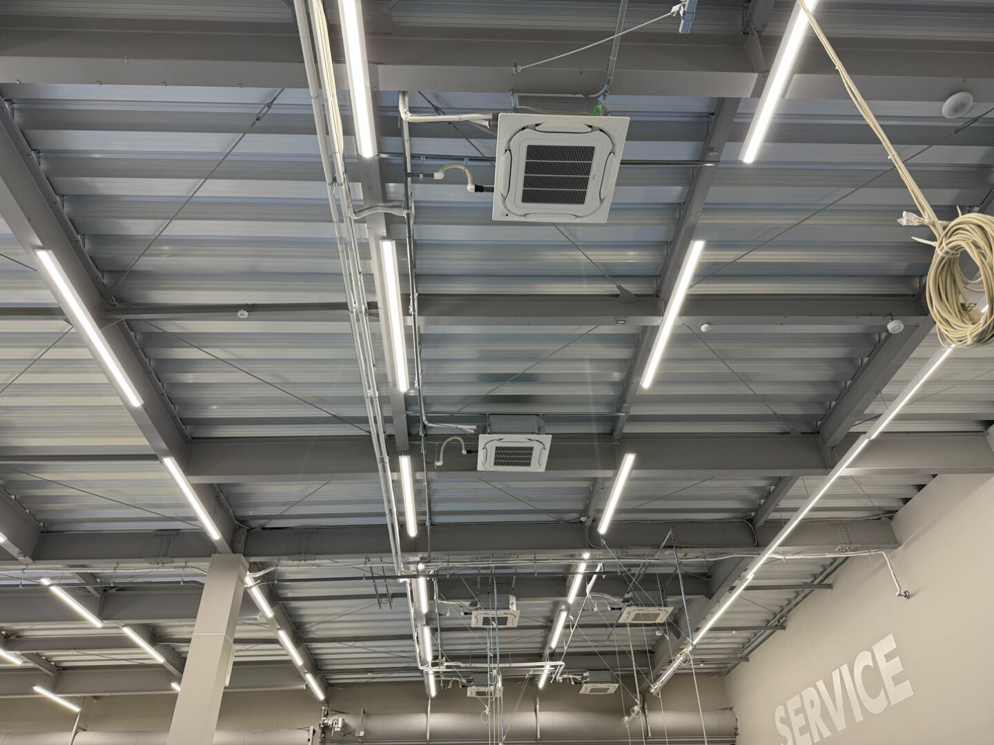 写真の通り、広い売場でもエアコン・ダクト・照明が整然と並び、