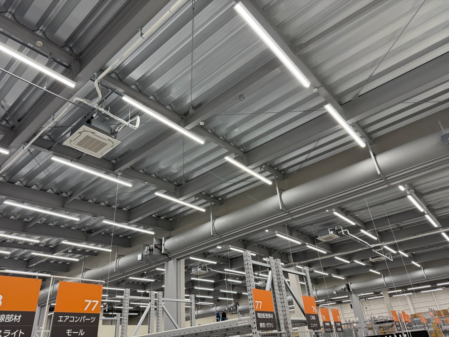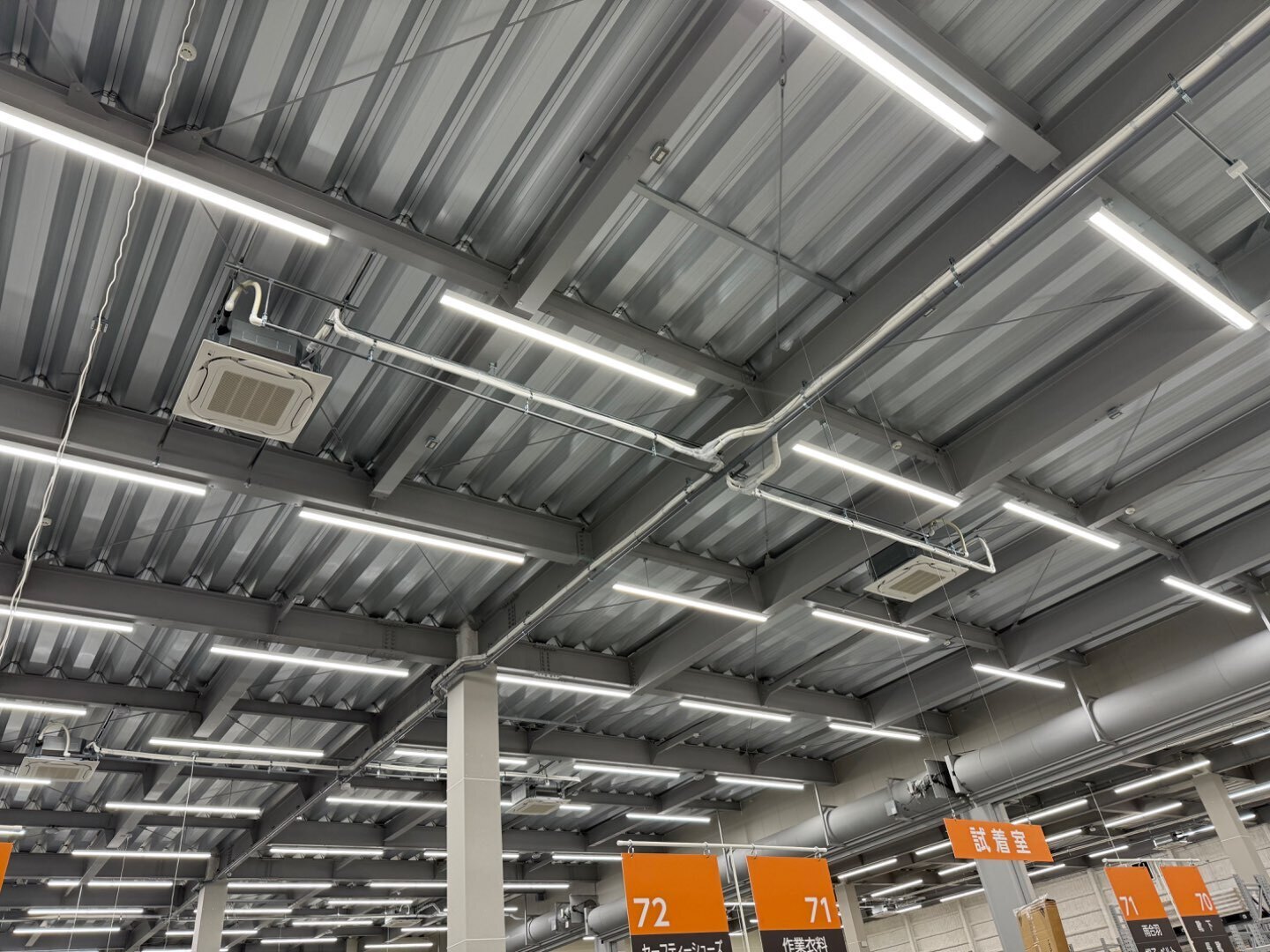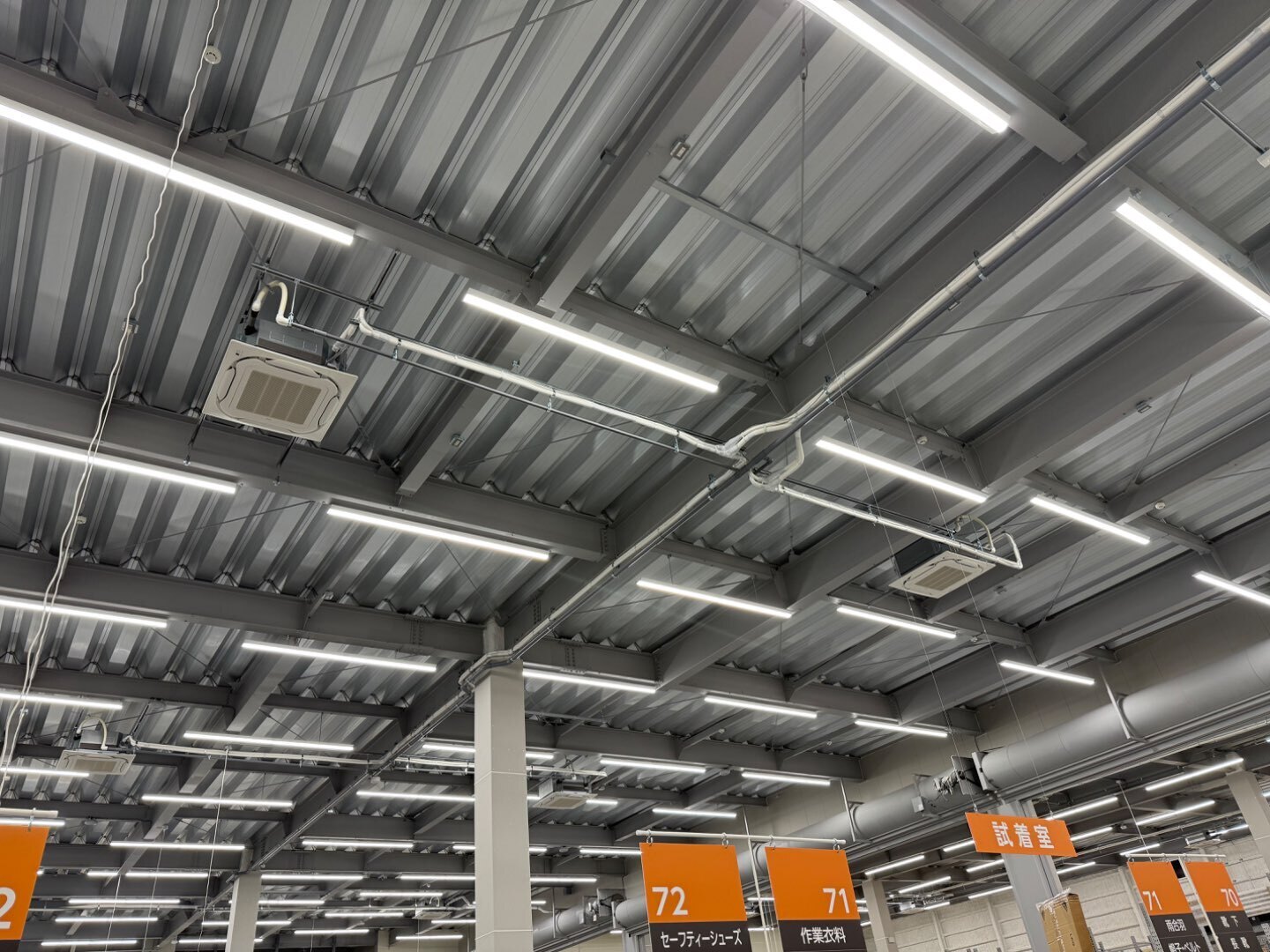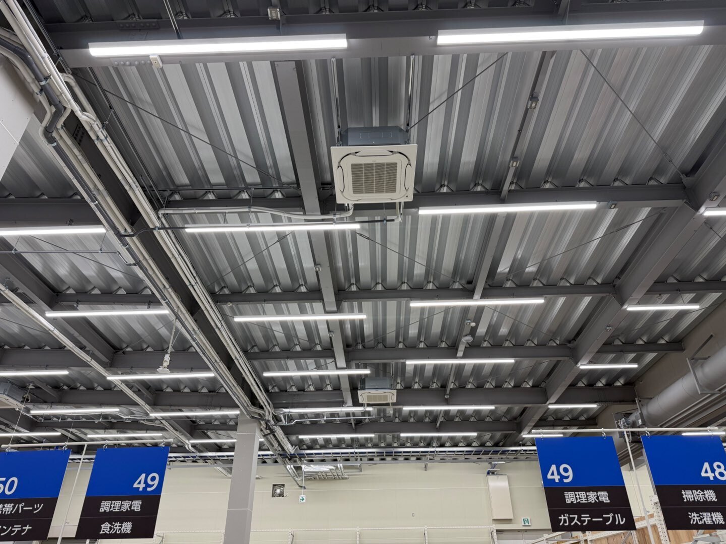 写真の通り、広い売場でもエアコン・ダクト・照明が整然と並び、