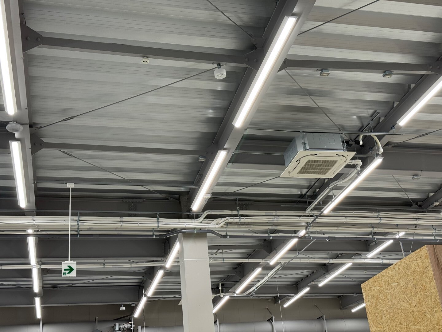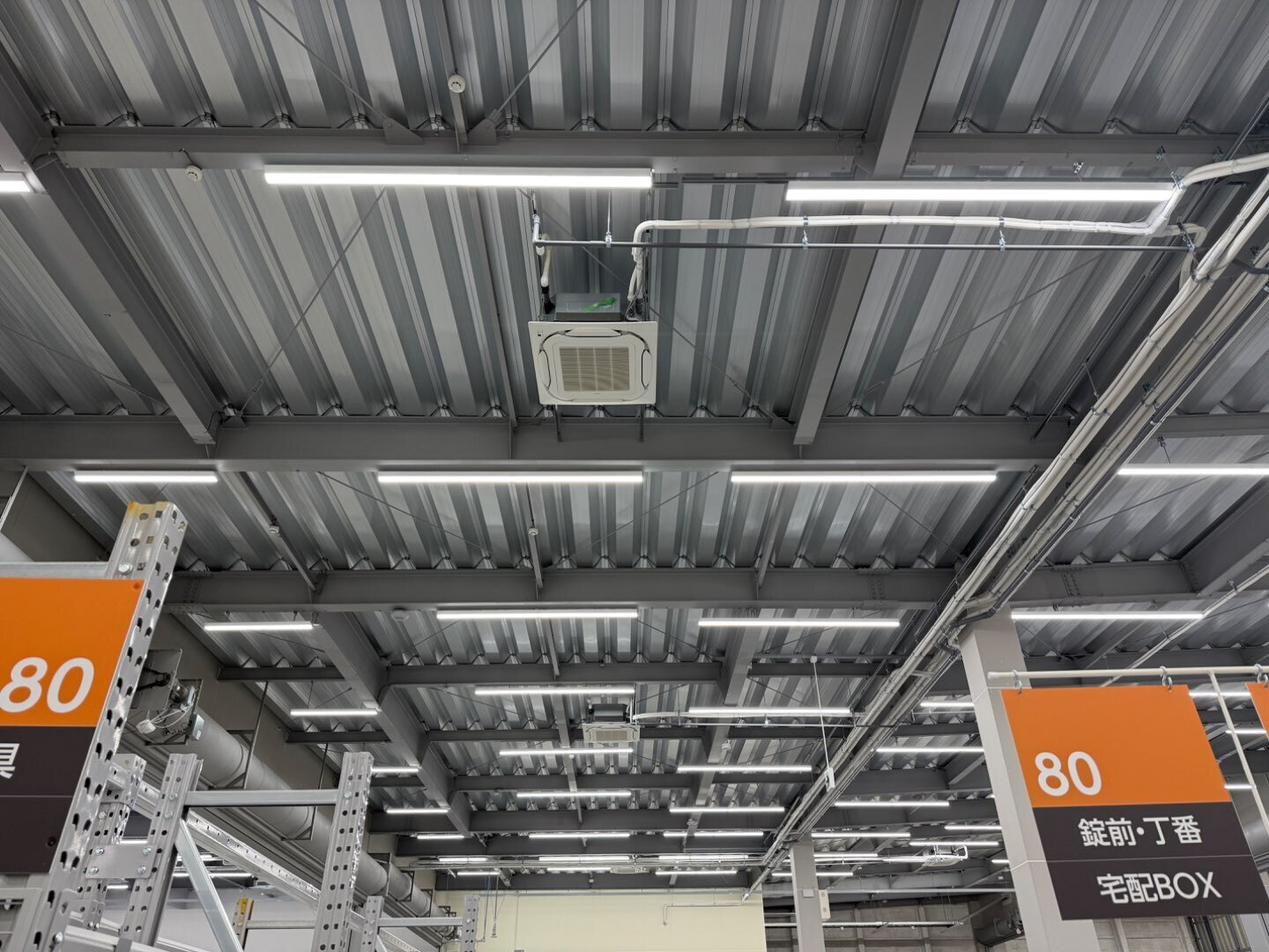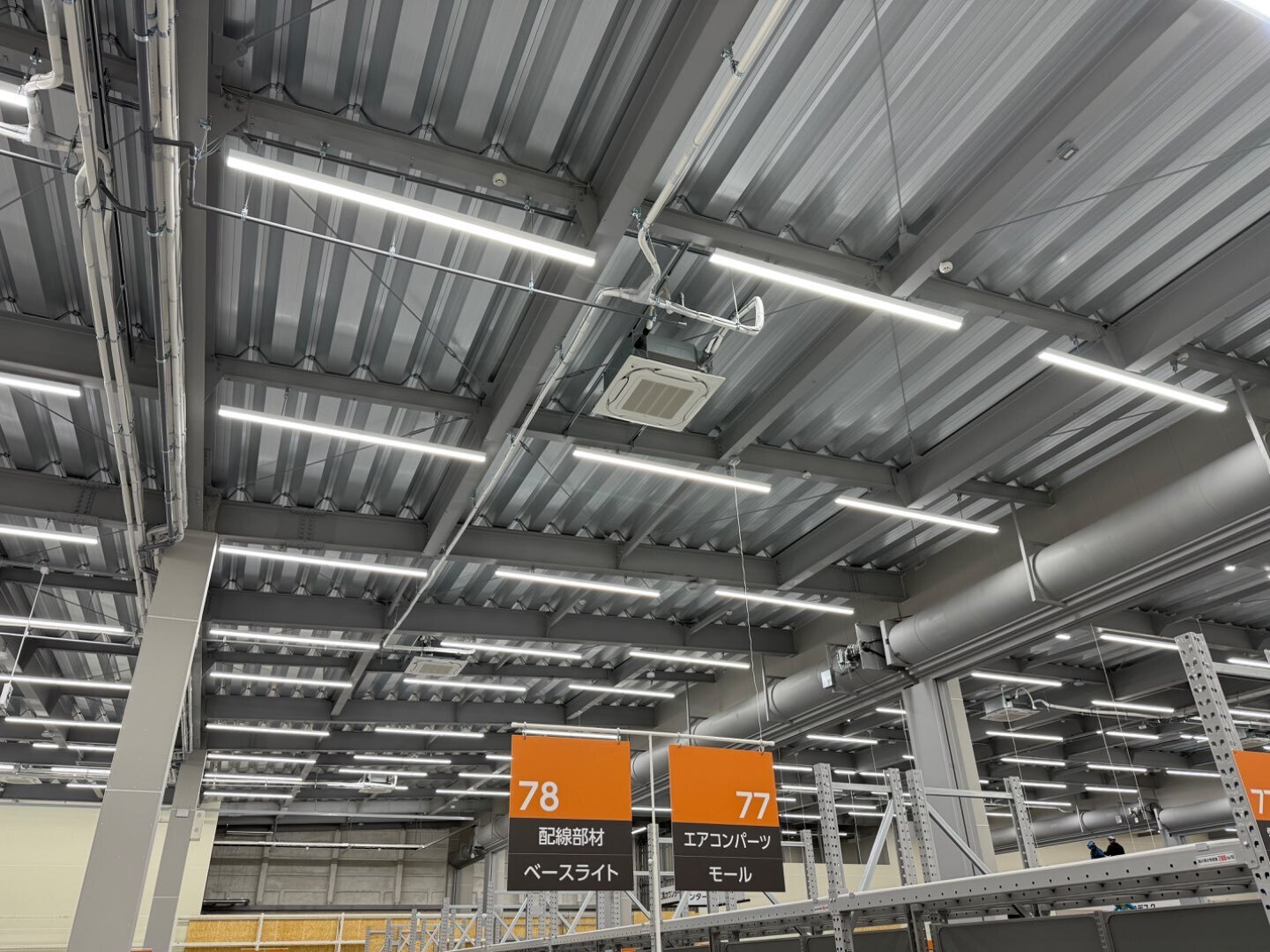 写真の通り、広い売場でもエアコン・ダクト・照明が整然と並び、