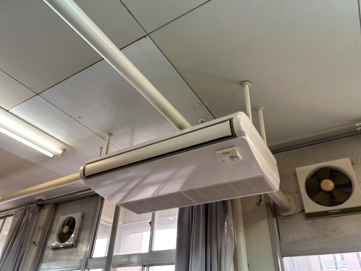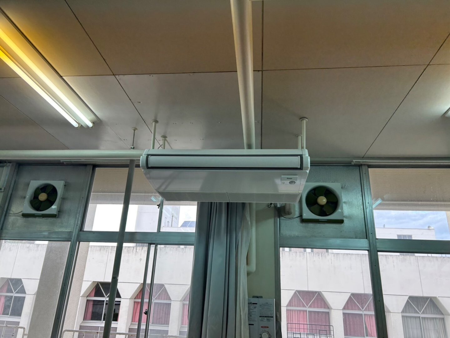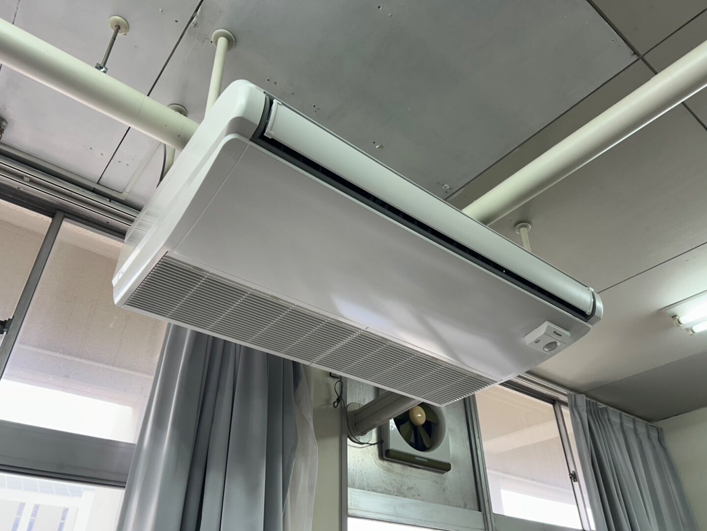 今回の室内機は、窓際上部に天吊形で設置しております。